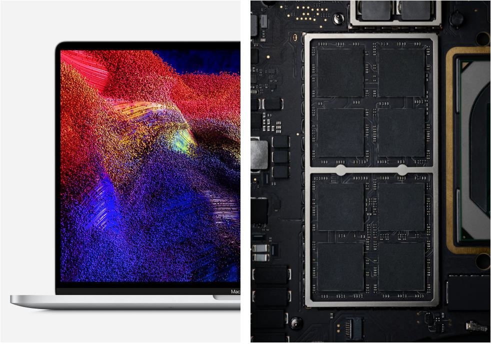 16palcový MacBook Pro přichází s úplně novou úrovní výkonu v notebooku. Díky vyspělejšímu termálnímu řešení může procesor Intel Core i9 až s osmi jádry a 16 vlákny udržet větší výkon delší dobu. Přitom dosahuje až 2,1krát vyššího výkonu než čtyřjádrový MacBook Pro. Ať vrstvíš desítky stop a efektů, rendruješ 3D modely, nebo kompiluješ a testuješ kód, půjde ti to od ruky úplně samo.