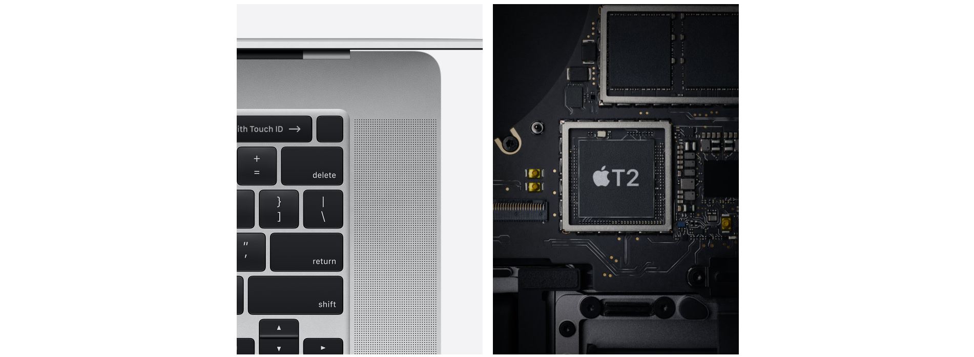 Každý MacBook Pro má Apple T2 Security – druhou generaci speciálního čipu, který jsme vyvinuli, aby byl Mac ještě bezpečnější. Jeho součástí je koprocesor Secure Enclave, který slouží jako základna pro Touch ID, zabezpečené startování systému a šifrované úložiště. Taky je v něm zkonsolidováno několik samostatných řadičů, například řadič řízení systému, řadič zvuku nebo řadič SSD úložiště.