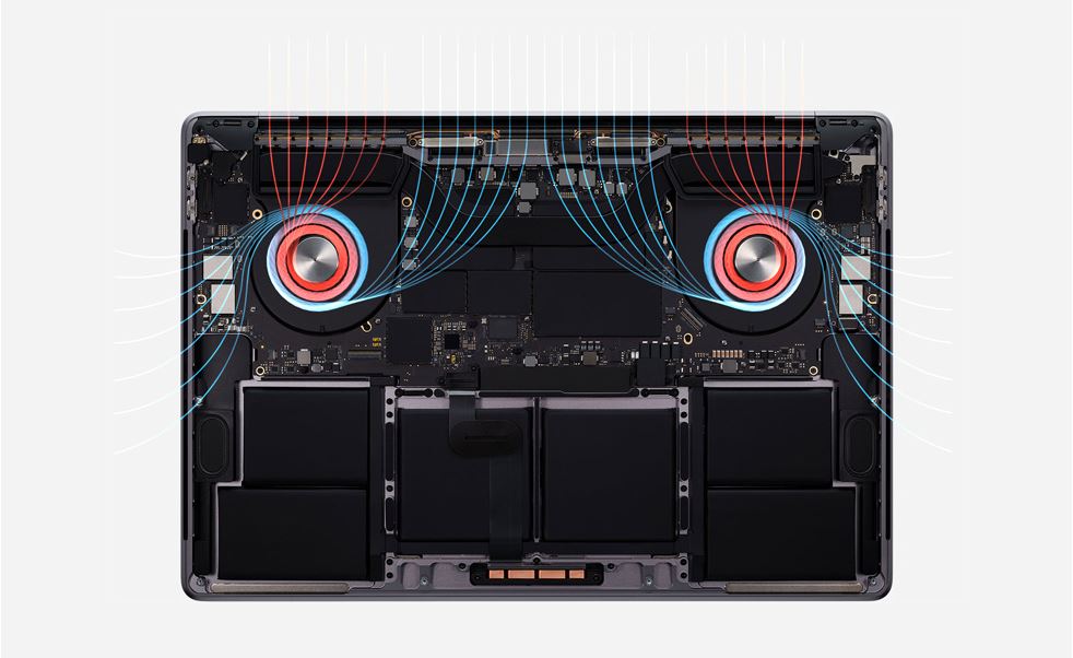 Vyspělejší termální architektura umožňuje rychlejší práci procesoru. Kompletně přestavěná termální architektura MacBooku Pro má větší lopatky větráčků pro optimální proudění vzduchu a víc chladicích žeber pro účinnější chlazení. Výsledný zisk ochlazovací kapacity umožňuje MacBooku Pro dosahovat až o 12 wattů vyššího maximálního udržitelného výkonu.