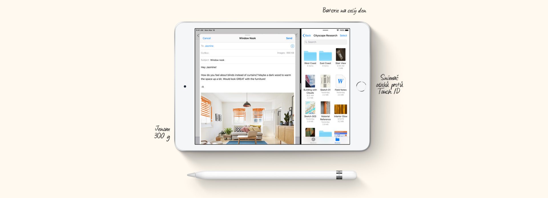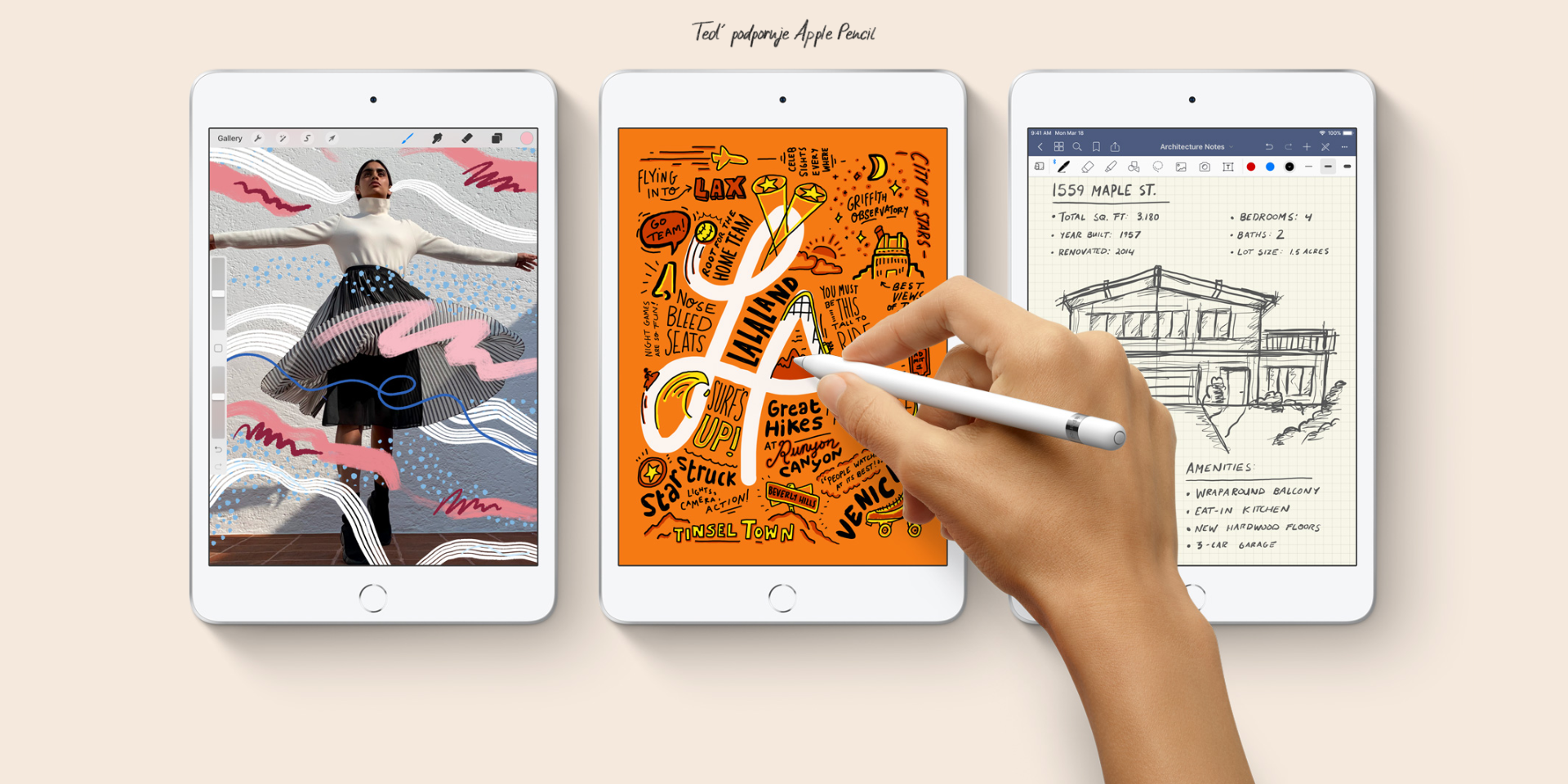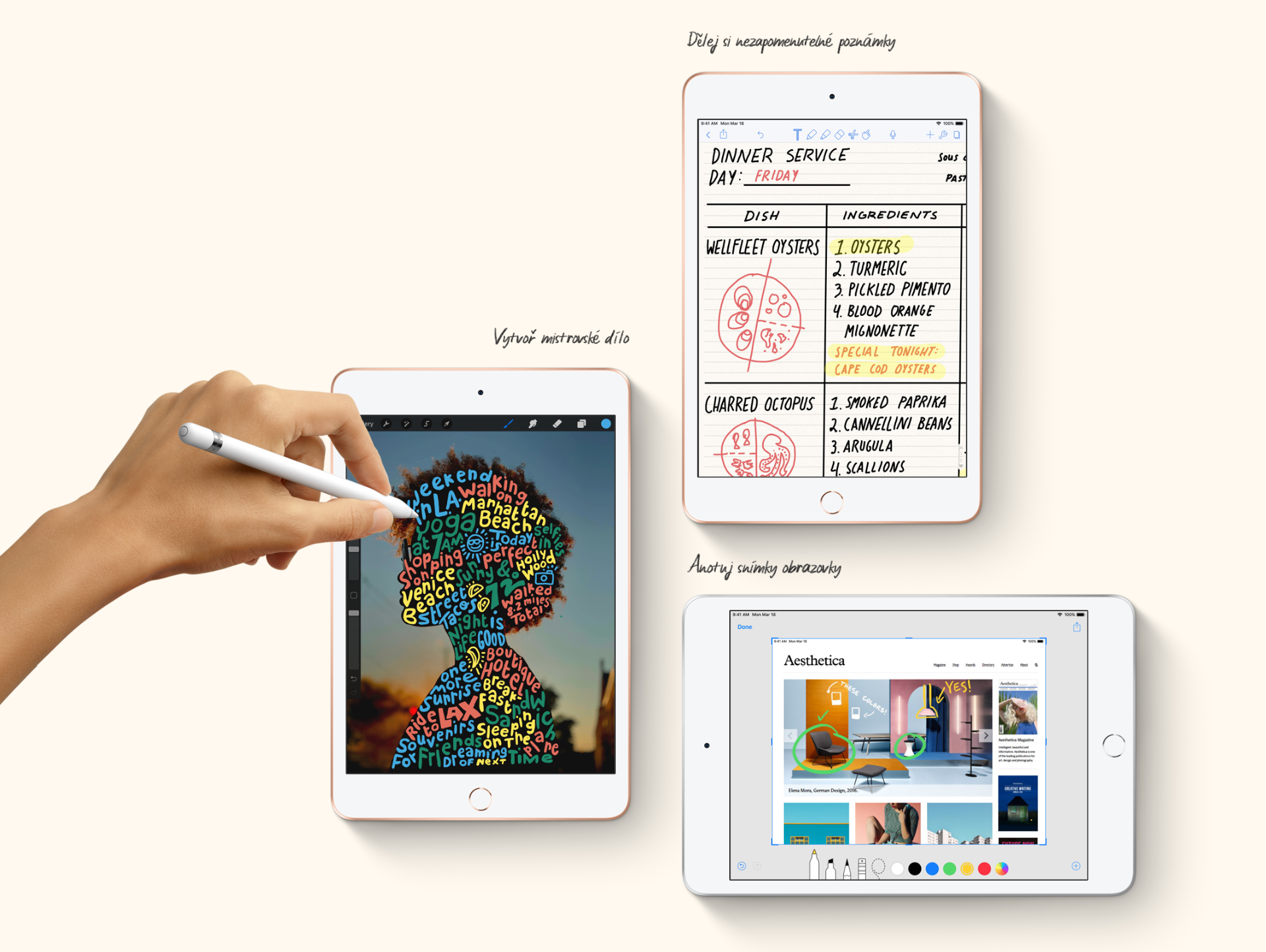 Apple Pencil otvírá nové možnosti. Udělá ti z iPadu mini digitální blok, který si můžeš vzít kamkoli. Dělej si poznámky, podepisuj dokumenty, vyplňuj formuláře. Nebo zachycuj své tvůrčí nápady kresbami, malůvkami a skicami.