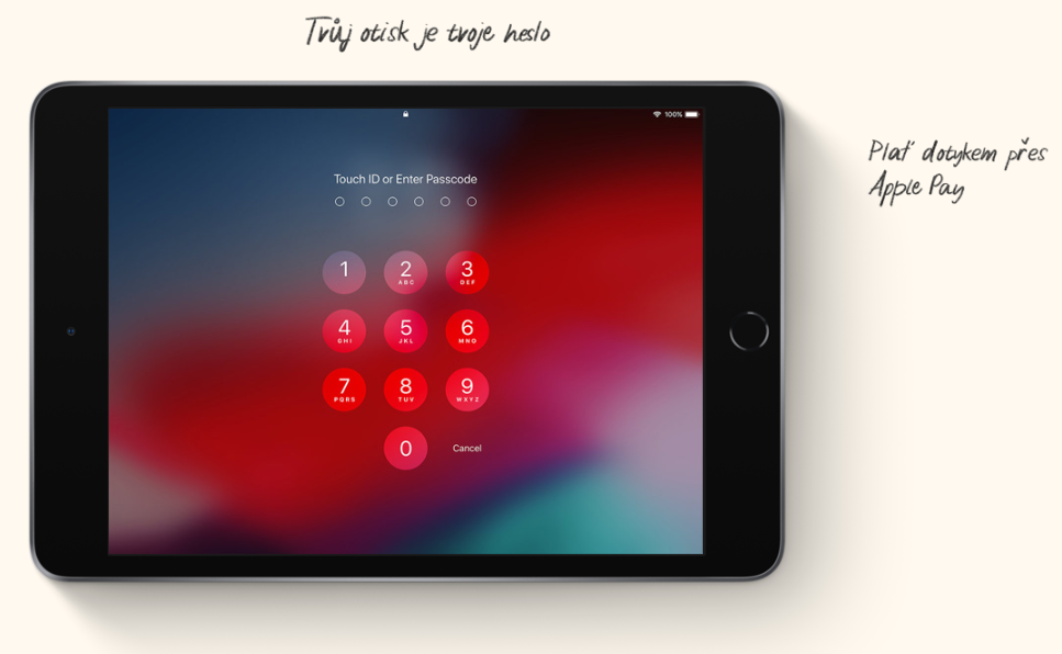 iPad mini je stejně jako všechny produkty Apple dělaný tak, aby chránil tvoje soukromí a byl dobře zabezpečený. Touch ID umožňuje iPad mini snadno a bezpečně odemykat. A pomocí Apple Pay pohodlně a bez rizika zaplatíš nákupy. Stačí přiložit prst na snímač Touch ID.