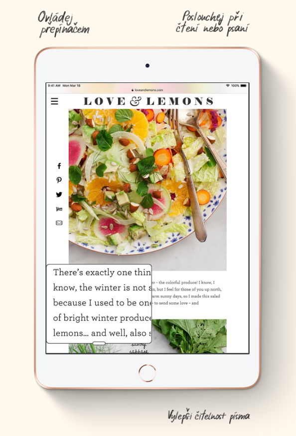 Technologie jsou podle nás nejšikovnější, když je může používat každý. Proto iPad mini obsahuje funkce zpřístupnění, které vycházejí vstříc specifickým zrakovým, sluchovým, motorickým nebo studijním potřebám. Od VoiceOveru, který nahlas popisuje obsah obrazovky, až po Switch Control, který umožňuje ovládat iPad mini bez dotýkání.