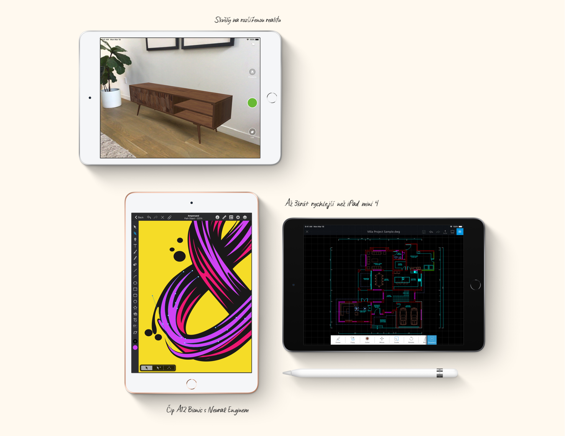 Lidé iPad mini milují, protože je malý a šikovný. Teď je důvodů, proč ho milovat, ještě víc. Čip A12 Bionic s Neural Enginem. 7,9palcový Retina displej s True Tone zobrazením. A Apple Pencil, kterým si poznamenáš svoje největší nápady, ať je dostaneš kdekoli. Pořád je to iPad mini. Jen toho umí ještě víc.