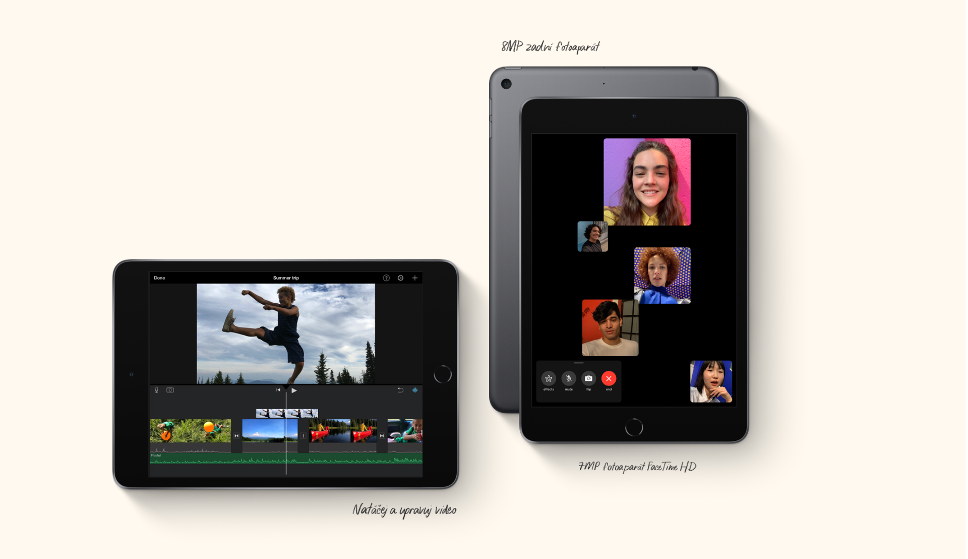 Předním a zadním fotoaparátem iPadu mini uděláš pěkné fotky a kinematografická videa. Ale tím zábava nekončí. Volej přes FaceTime kamarádům, skenuj a anotuj dokumenty nebo si klidně v rozšířené realitě naplánuj přestavbu obýváku.