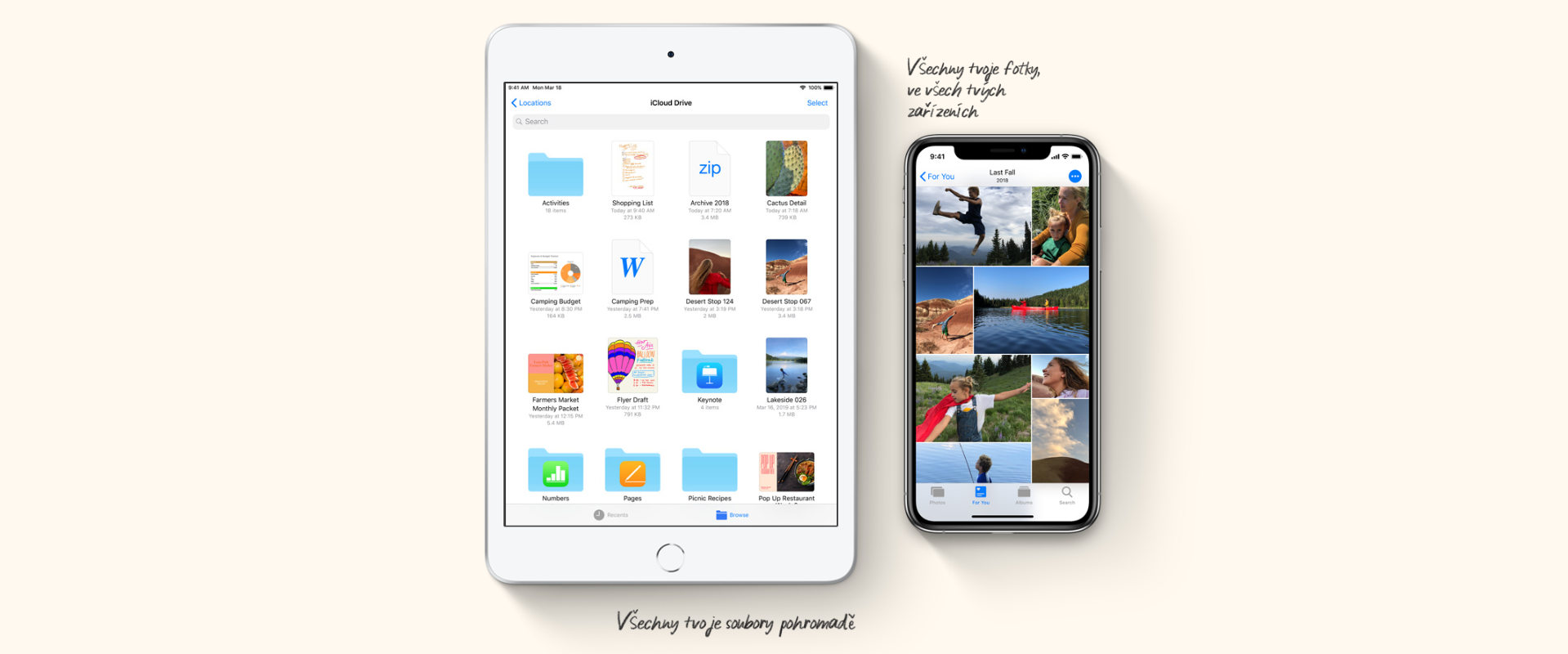 Na iCloudu máš fotky, soubory i poznámky zabezpečené, aktuální a pohodlně přístupné ze všech svých zařízení.4 A v aplikaci Soubory máš pohromadě všechny svoje věci – uložené na iCloud Drivu i na iPadu mini.