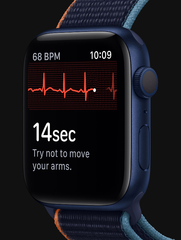 Aplikace EKG na Apple Watch Series 6 dokáže vygenerovat elektrokardiogram podobný jednosvodovému EKG. U tak malého zařízení je to něco mimořádného. Lékařům poskytuje důležitá data a uživatelům klid v duši.