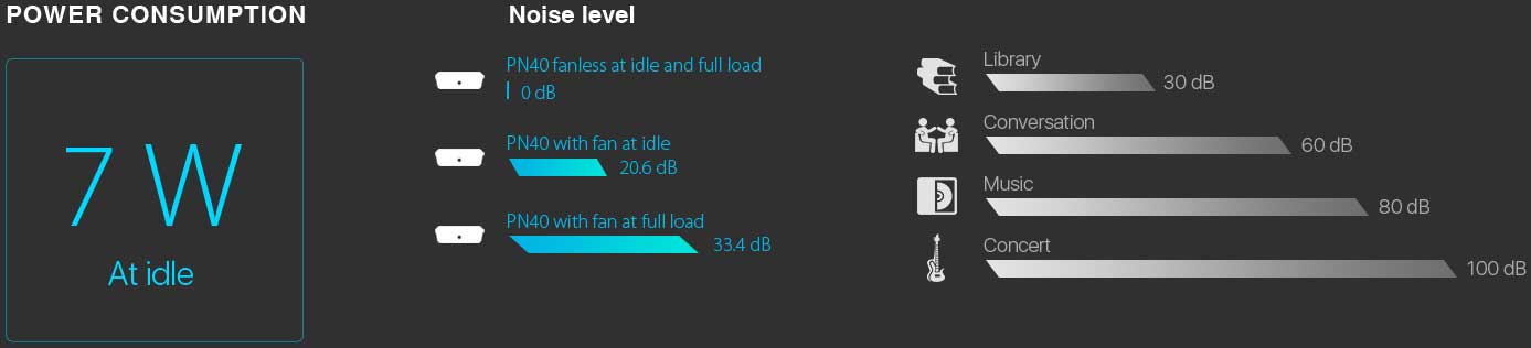 ASUS Mini PC PN40 má energeticky úsporný design, který zmírňuje dopad na životní prostředí a pomáhá vašemu podnikání snižovat provozní náklady. Ekologicky šetrné počítače ASUS mini jsou držiteli mnoha nejdůležitějších environmentálních certifikací ve svém oboru, včetně certifikace Energy Star. Mini PC PN40 spotřebovává při pohotovostním režimu pouze 6,4 W a je v tomto režimu také mimořádně tichý - pouhých 20,6 dB. Je k dispozici také s bezventilátorovou konstrukcí*, která pracuje v naprosté tichosti bez ohledu na aktuální pracovní zátěž.