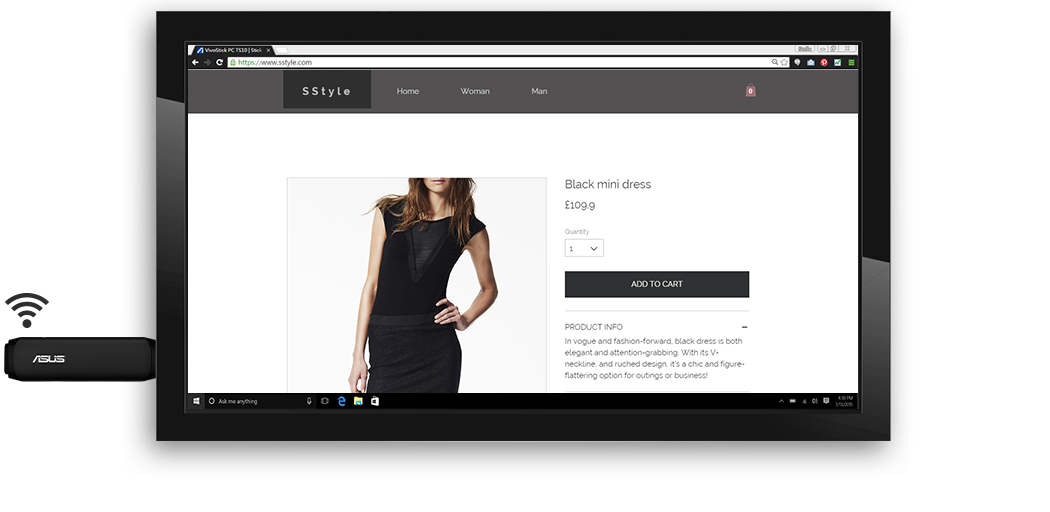Se zařízením VivoStick budete mít k dispozici výkon stolního počítače i úžasný Full HD obraz, o což se postará procesor Intel Atom ukrytý uvnitř. Není třeba nic nastavovat, VivoStick se spustí velmi rychle a je ihned připraven k použití. Stejně úžasné jako extrémně kompaktní provedení jsou i technické parametry zařízení – 2 GB operační paměti, 32 GB integrovaného úložiště, dvoupásmové připojení 802.11ac Wi-Fi, technologie Bluetooth 4.1, porty USB 3.0 a USB 2.0, zvukový konektor a port HDMI. Navíc získáte 100 GB volného prostoru v on-line úložišti ASUS WebStorage, takže i ze světa můžete pomocí počítače VivoStick PC přistupovat k souborům uloženým v cloudu.