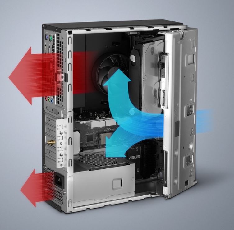Pro zajištění stabilního výkonu v kompaktním šasi využívá ExpertCenter D7 SFF inovativní vícekanálový systém chlazení. Ten se skládá z izolovaných vzduchových komor, které odvádí teplo nezávislými kanály od jeho hlavních zdrojů v počítači – procesoru, grafiky a napájecího zdroje. ExpertCenter D7 SFF využívá také exkluzivní aplikaci MyASUS, která optimalizuje provoz procesoru a ventilátorů, automaticky upravuje jejich otáčky, a pokud je to možné, zcela je vypíná, čímž dosahuje dokonalé rovnováhy mezi maximálním výkonem a minimální hlučností.