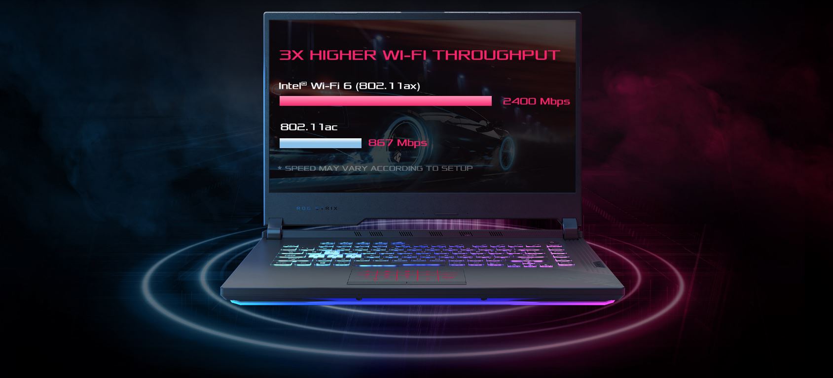 Ultrarychlá Intel® Wi-Fi 6 s Gig+ (802.11ax) vám umožní spolehlivě hrát rychlostí LAN všude tam, kde jsou dostupná kompatibilní připojení. Wi-Fi 6 (Gig +) umožňuje maximální šířku pásma rozhraní až 2,4 Gbps*, se zvýšenou rychlostí sítě, efektivitou a spolehlivostí v přeplněných prostorech. Snižuje se také latence, což znamená menší zpoždění při činnostech citlivých na síť, jako jsou rychlé hry na cestách. Technologie ROG RangeBoost doplňuje vaše Wi-Fi 6 maximalizací pokrytí. Unikátní algoritmus RangeBoost vyhodnocuje sílu signálu čtyř interních antén a vybírá nejlepší pár, který lze použít pro vaši polohu, minimalizuje mrtvá místa a zvyšuje dosah až o 30%.