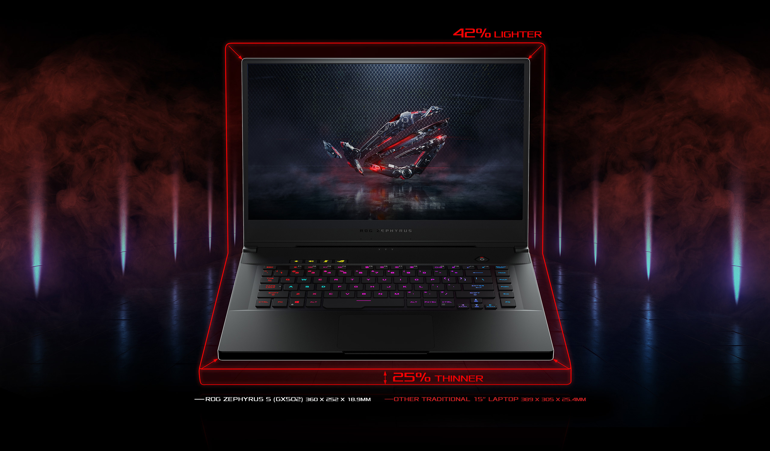 Impozantně lehká konstrukce skrývá ohromnou sílu. Zephyrus S GX502 má tloušťku 18,9 mm a hmotnost méně než 2 kg a je o 25% tenčí a 42% lehčí než běžné 15" notebooky. Odmítá však jakékoliv kompromisy mezi výkonem pro práci a hru a přináší dynamický výkon a rafinovaný styl, který kombinuje skutečně to nejlepší z obou světů. Jeho elegantní, vyztužený kovové tělo ho činí odolným proti každodennímu opotřebení, zatímco jemná, měkká kůže podél opěrky rukou mu dává nádech elegance a čisté linie.