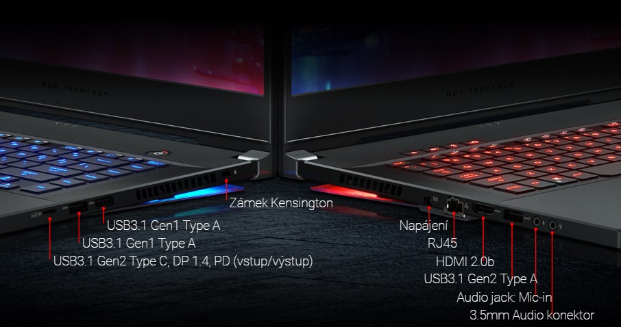 ROG Zephyrus S GX502 je vybaven rozhraním USB 3.1 Gen 2 typu C s technologií DisplayPort™ 1.4 a napájením, portem typu A pro velmi rychlé přenosy a dvěma porty USB 3.1 Gen 1, které jsou ideální pro myš a herní podložku. Sledujte vaši hru či jinou zábavu na velké obrazovce s výstupem HDMI 2.0, který podporuje rozlišení 4K UHD při až 60Hz. 802.11ac Gigabit Wi-Fi poskytuje rychlý online přístup pro každodenní aktivity, zatímco konektor Gigabit Ethernet nabízí nejnižší latenci pro hry pro více hráčů a LAN party.