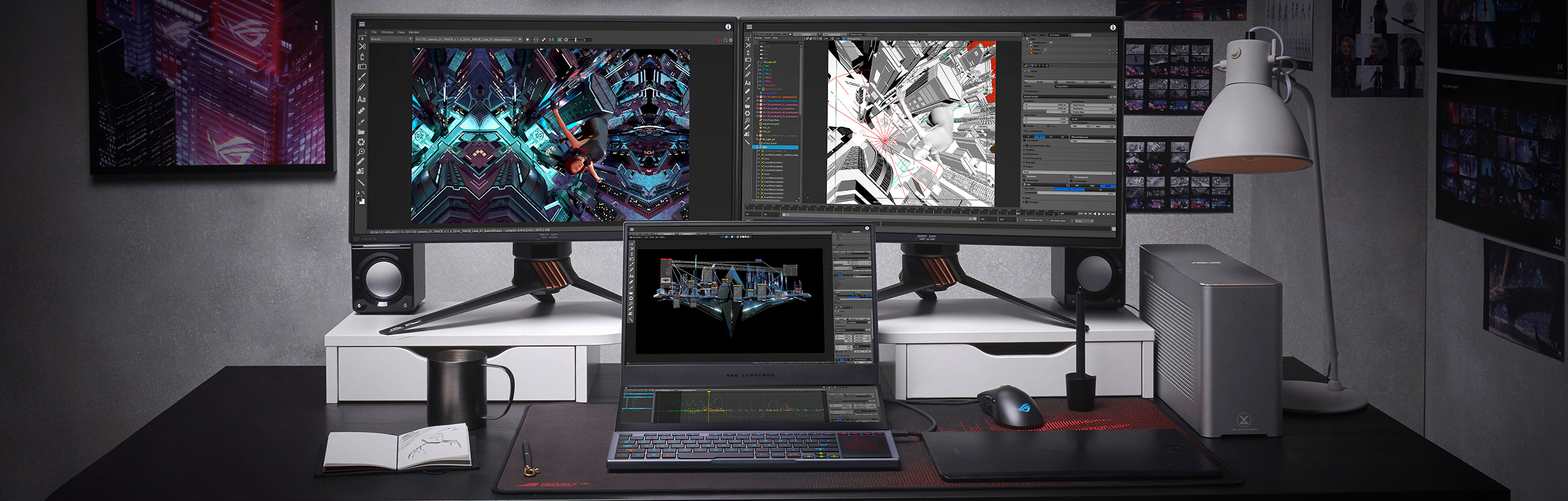 Přizpůsobte primární displej tak, aby vyhovoval vašim potřebám. Tvůrce obsahu potěší detaily s vysokým rozlišením a široká škála barev 4K UHD displeje, továrně kalibrované pro přesnost ve 100% barevného prostoru Adobe RGB. Hráči mohou využít herního panelu FHD o frekvenci 300 Hz pro herní grafiku na vyšší úrovni. Jeho doba odezvy 3 ms minimalizuje rozmazání pro větší přesnost při sledování rychle se pohybujících cílů. Režim NVIDIA G-SYNC® posouvá vizuální ponoření na další úroveň a nabízí vám nejsilnější grafiku hry. Sekundární displej ScreenPad Plus přidává do kreativní sady nástrojů nástroj pro dotykovou obrazovku, podporu stylusu a životně důležitý prostor.