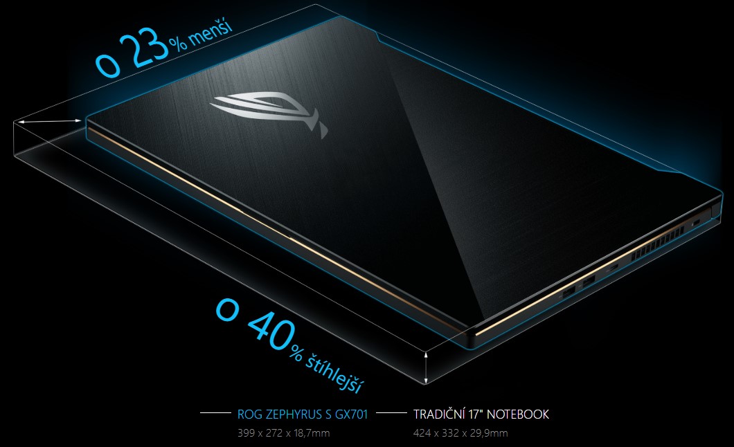 ROG Zephyrus S nastavil standard pro ultra tenké herní notebooky s Windows 10 Pro. Nyní má ještě větší ambice díky 17-palcovému displeji s úzkým rámečkem a tělem tenkým pouhých 18,7 mm. Zephyrus S GX701 je nabitý grafikou GeForce RTX™ 2080 a nejnovější generací procesoru Intel® Core™. Nechte se pohltit jeho 300Hz panelem s barvami validovanými Pantone® a použijte ROG exkluzivní přepínač GPU pro změnu mezi režimem G-SYNC™ pro hraní a režimem Optimus pro dlouhou životnost baterie.