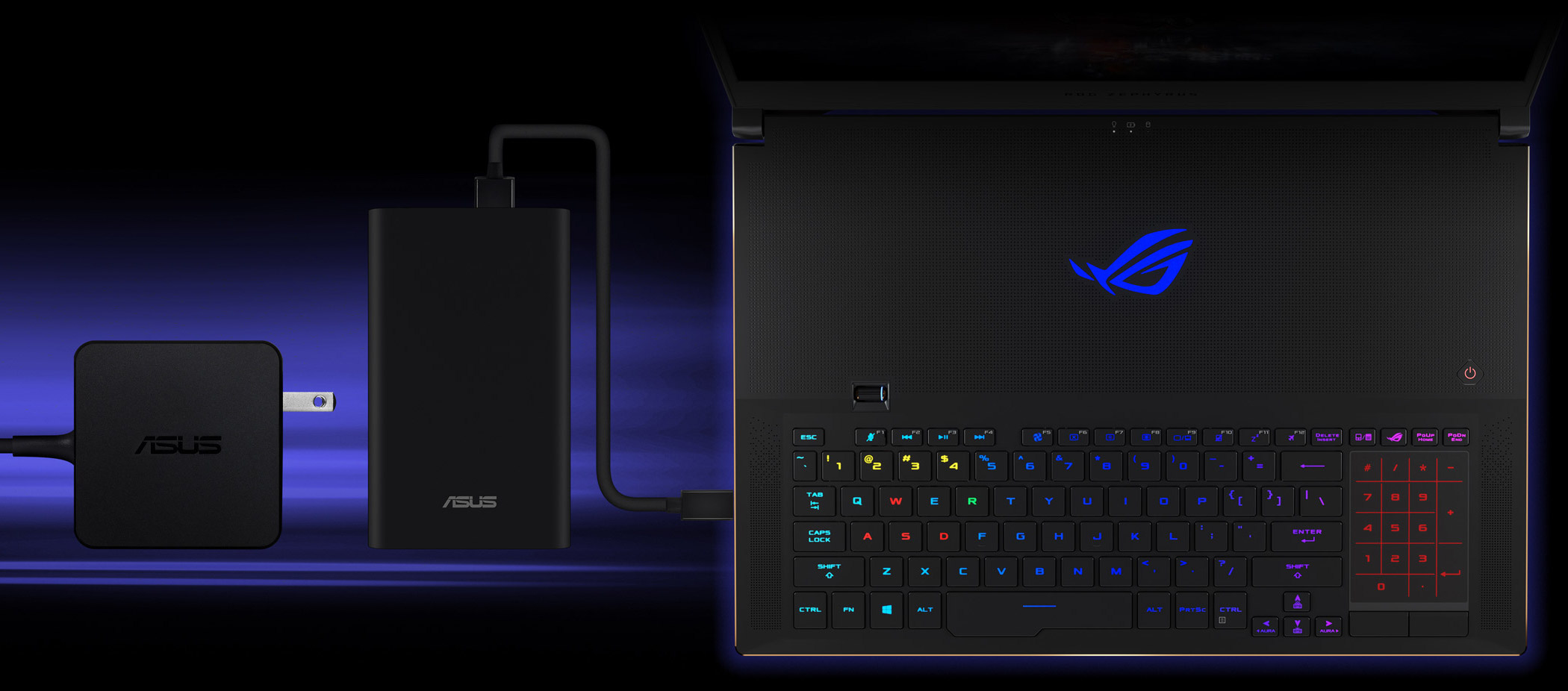 ROG produkty byli mezi prvními, které podpořili nabíjení herních notebooků prostřednictvím USB Typu C. Napájení přes USB umožňuje Zephyru S využívat energii z přenosných napájecích zdrojů, takže při vybití baterie nemusíte hledat zásuvku. Podpora rychlého nabíjení obrátí tok energie až na 3A, takže snadno a rychle oživíte svůj smartphone či jiné zařízení. Můžete také provádět každodenní práci s menším 65W adaptérem, který oceníte zejména na cestách.