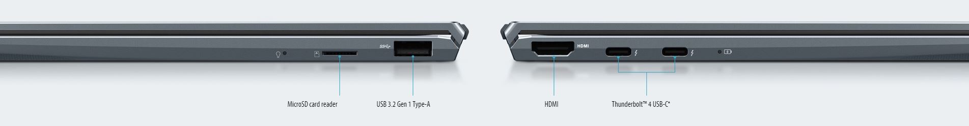 ZenBook 14 předefinuje, co je možné v ultratenkém laptopu, aby vám poskytl plnou nabídku I / O portů, včetně HDMI a USB typu A v plné velikosti. Síla Thunderbolt™ 4 je také k dispozici se dvěma Thunderbolt™ 4 USB-C® porty, které podporují rychlé nabíjení 4K UHD externích displejů a datové přenosy až do 40Gbps. Pro snadný přenos dat z mobilních zařízení je k dispozici také čtečka karet microSD.