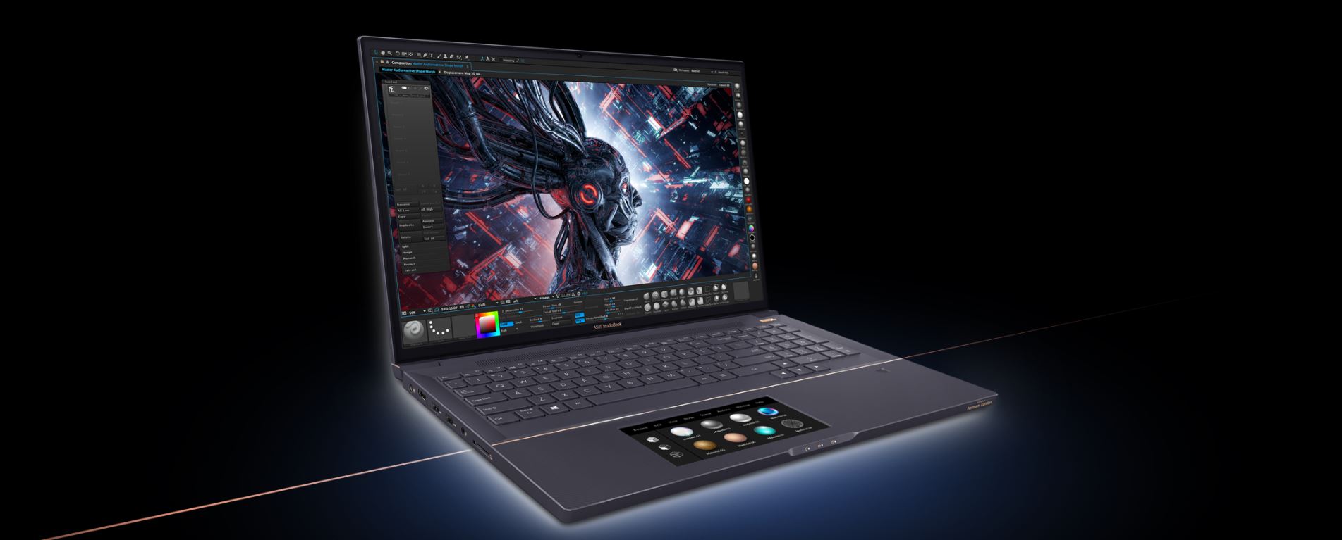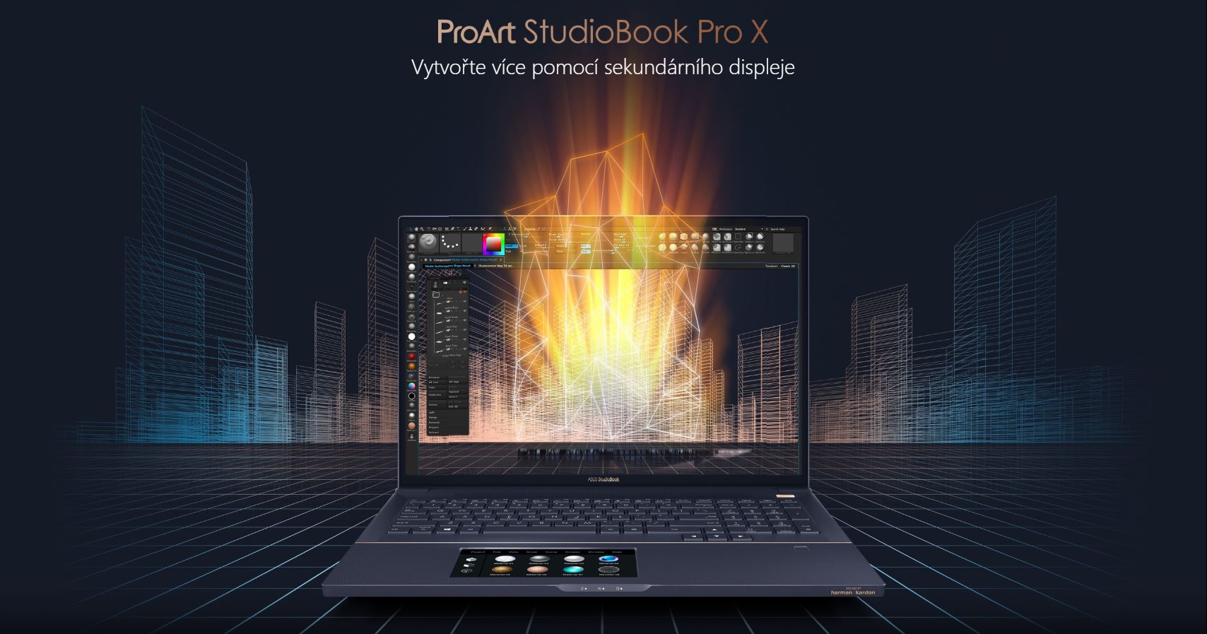 ProArt StudioBook Pro X je první notebook s technologií Quadro®, který je vybaven displejem NanoEdge po všech čtyřech stranách panelu, díky čemuž se jedná o výkonnou mašinu, díky které ožijí všechny vaše nápady. Inovativní konstrukce NanoEdge s tenkým rámečkem umožňuje, aby se větší panel vešel do jeho kompaktního šasi a poskytl tak pohlcující vizuální efekty. Je poháněn až 9. generací procesorů Intel® Core® i7. ProArt StudioBook Pro X nabízí vynikající výkon, zatímco jeho NVIDIA® Quadro® T2000 GPU zajišťuje grafickou zdatnost na špičkové úrovni. Přidáním interaktivního ASUS ScreenPad® 2.0 se vaše práce stává zábavou. ProArt StudioBook Pro X nabízí kombinaci špičkové grafiky a mobility, díky čemuž je ideální pro kreativní profesionály.