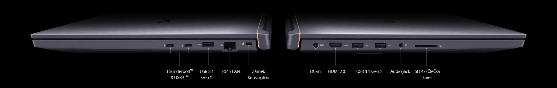 Komplexní sada vysoce výkonných I/O portů, včetně dvou portů Thunderbolt™ 3, poskytuje ProArt StudioBook Pro X dokonalou a bezproblémovou konektivitu pro všestrannou flexibilitu, ať už jste v kanceláři nebo na cestách. ProArt StudioBook Pro X dokonce můžete připojit až ke třem externím displejům. Má gigabitový Ethernet a je jedním z prvních produktů na světě s Intel Wi-Fi 6 s technologií Gig+ (802.11ax), takže si můžete vychutnat ekvivalentní rychlost sítě - bez kabelů!
