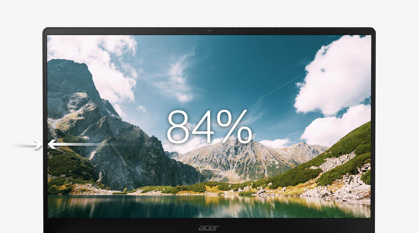 Více obrazu na menším prostoru Díky velmi úzkému rámečku ze dvou stran a působivému poměru obrazovky k tělu vidíte ze 14" FHD IPS dotykové obrazovky mnohem více. Technologie Acer Color Intelligence™ a Exacolor zajišťují lepší barevný kontrast.