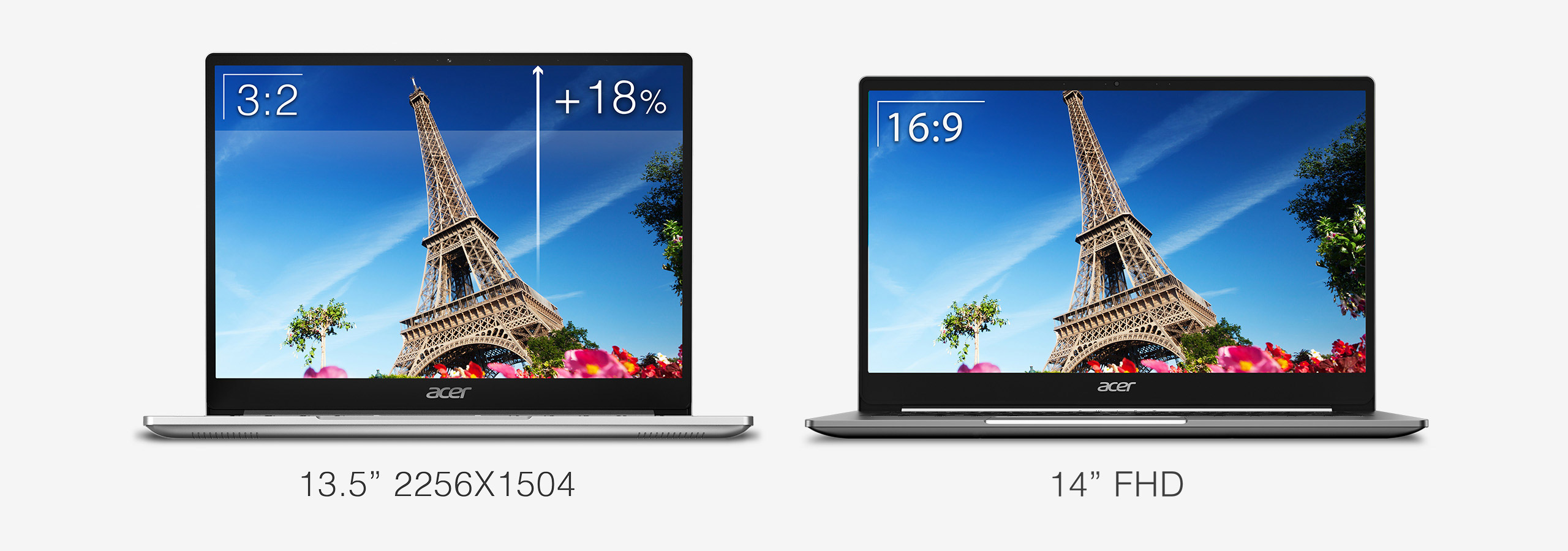 Více obrazu na menším prostoru Díky velmi úzkému rámečku ze dvou stran a působivému poměru obrazovky k tělu uvidíte z 13,5" displeje VertiView s poměrem stran 3:2, rozlišením 2256 x 1504 a technologií IPS, nebo 14" obrazovky FHD s poměrem stran 16:9 a technologií IPS mnohem více. Technologie Acer Color Intelligence™ a ExaColor™ zajišťují lepší barevný kontrast.
