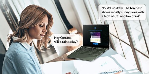 Možnost aktivace a pokládání dotazů v systému Windows 10 i při vypnuté obrazovce. Moderní pohotovostní režim umožňuje interakce s asistentkou Cortanou.