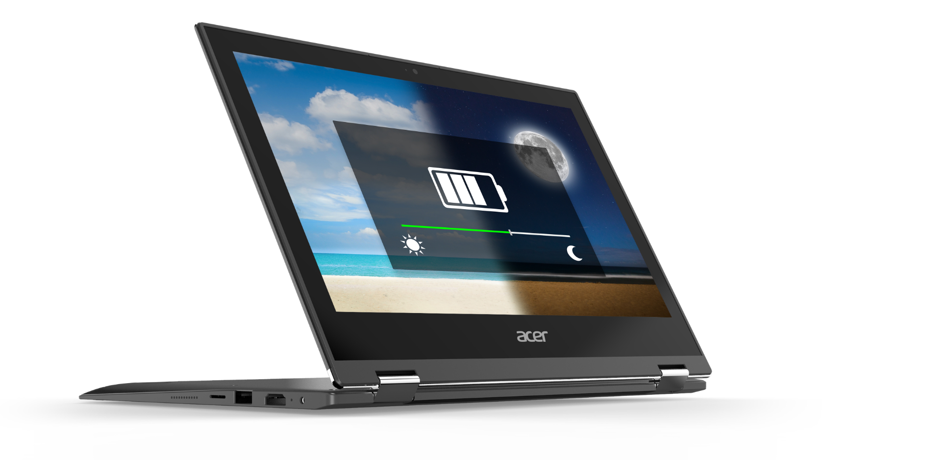 Díky 360° pantům můžete notebook Acer využívat ve čtyřech rozdílných režimech. Tyto panty s dvojitým momentem umožňují naklonit dotykovou obrazovku úplně dozadu a při posouvání a klepání se nechvějí. Režim stanu, tabletu, tradičního notebooku a displeje – zvolte si úhel, který vám vyhovuje.