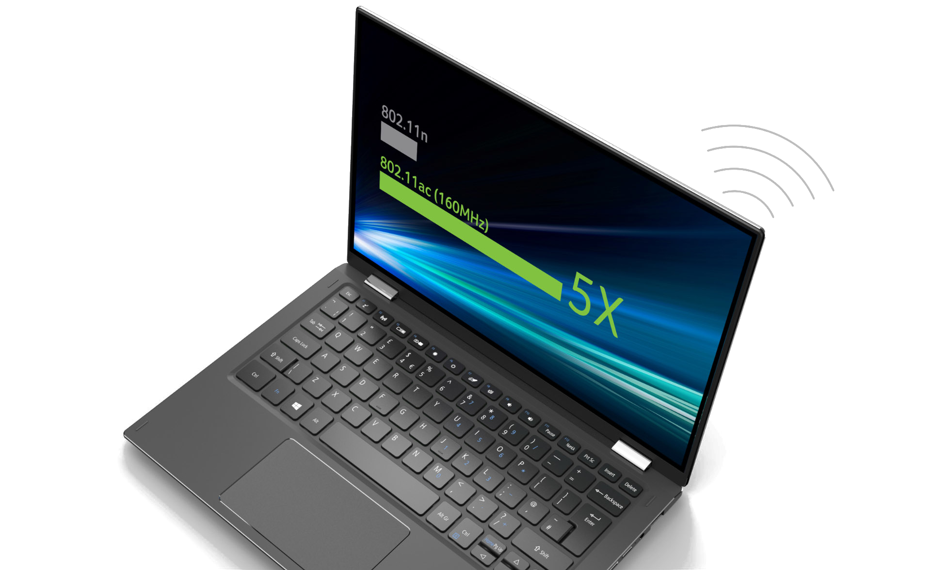 Gigabitové připojení Wi-Fi vám umožňuje udržovat silný, stabilní bezdrátový signál. Bezdrátová technologie nové generace a strategicky umístěná anténa pomáhají maximalizovat přenositelnost notebooku. Díky více než pětkrát rychlejšímu bezdrátovému přenosu než u předchozí technologie 2x2 802.11n stihnete mnohem více.