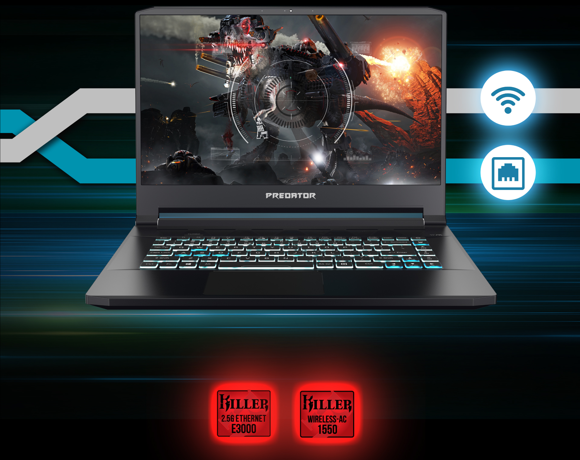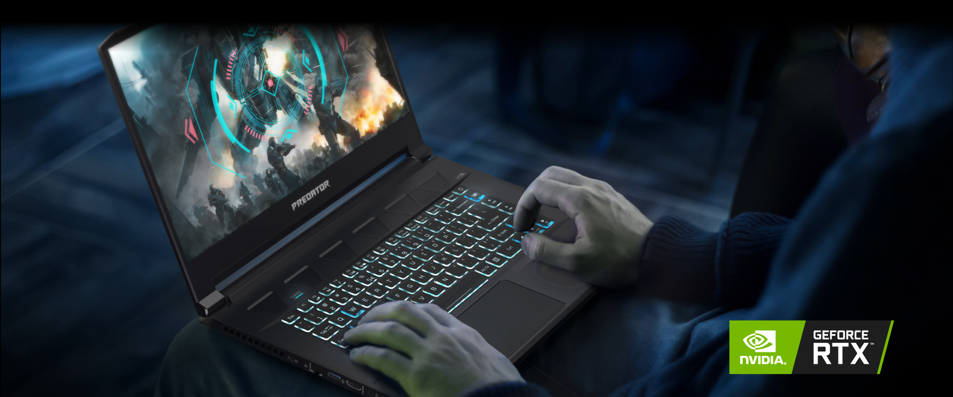 Černočerný kovový Triton 500 jsme navrhli za jasným účelem – abyste mohli hrát, kdekoli a kdykoli se vám zlíbí. A když se kryt s LED podsvícením a zdobením ve stylu Predator probere k životu, bude vám hned jasné, že tohle není jen tak obyčejný herní notebook.