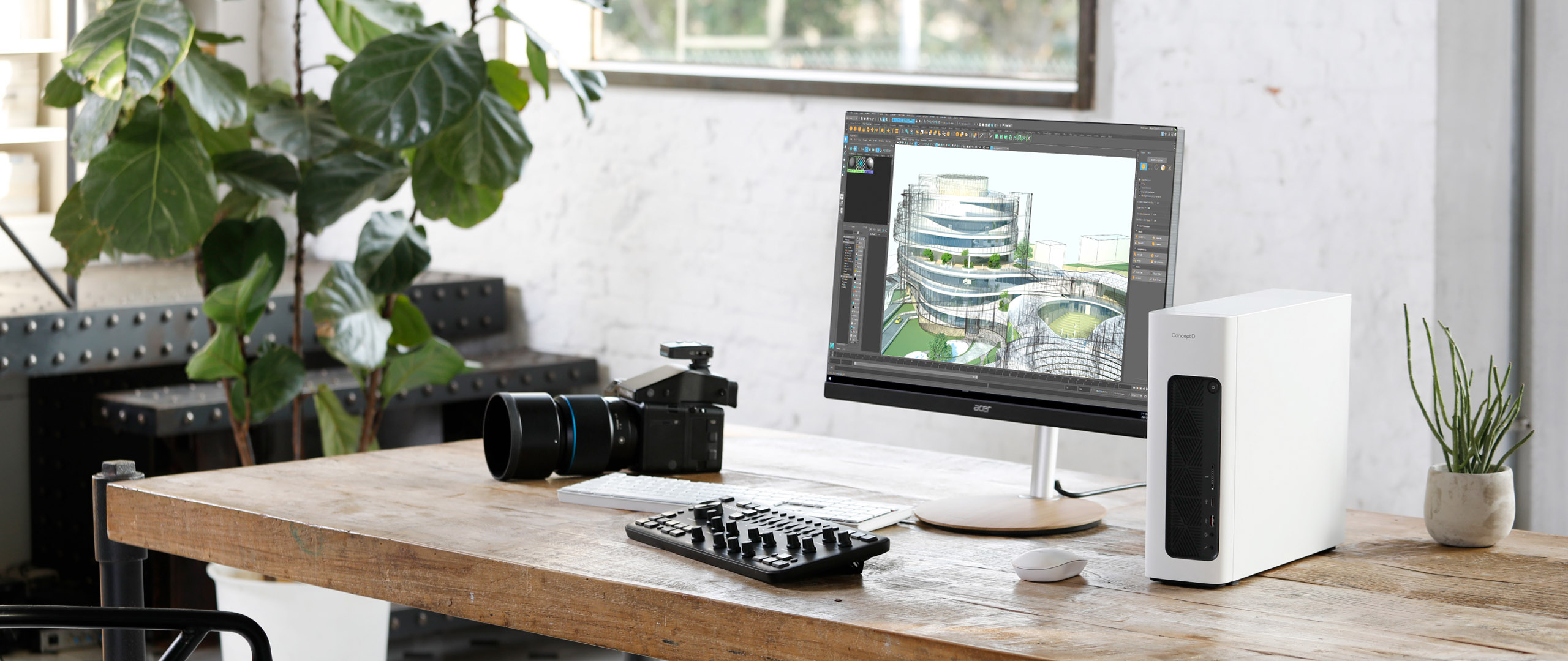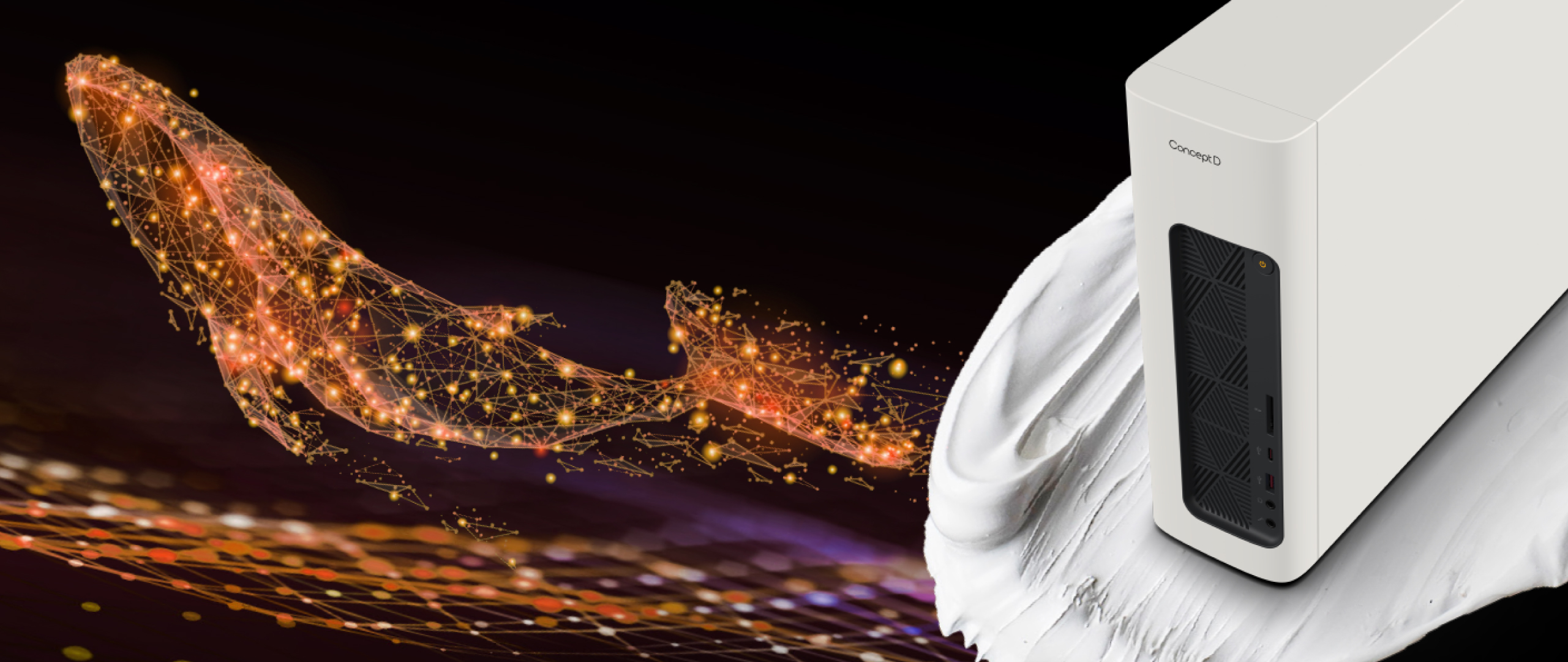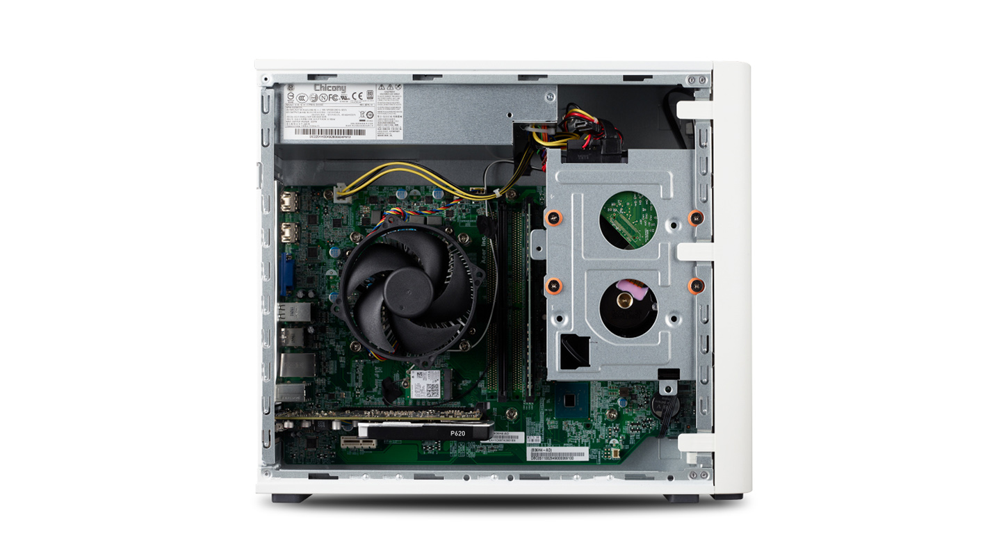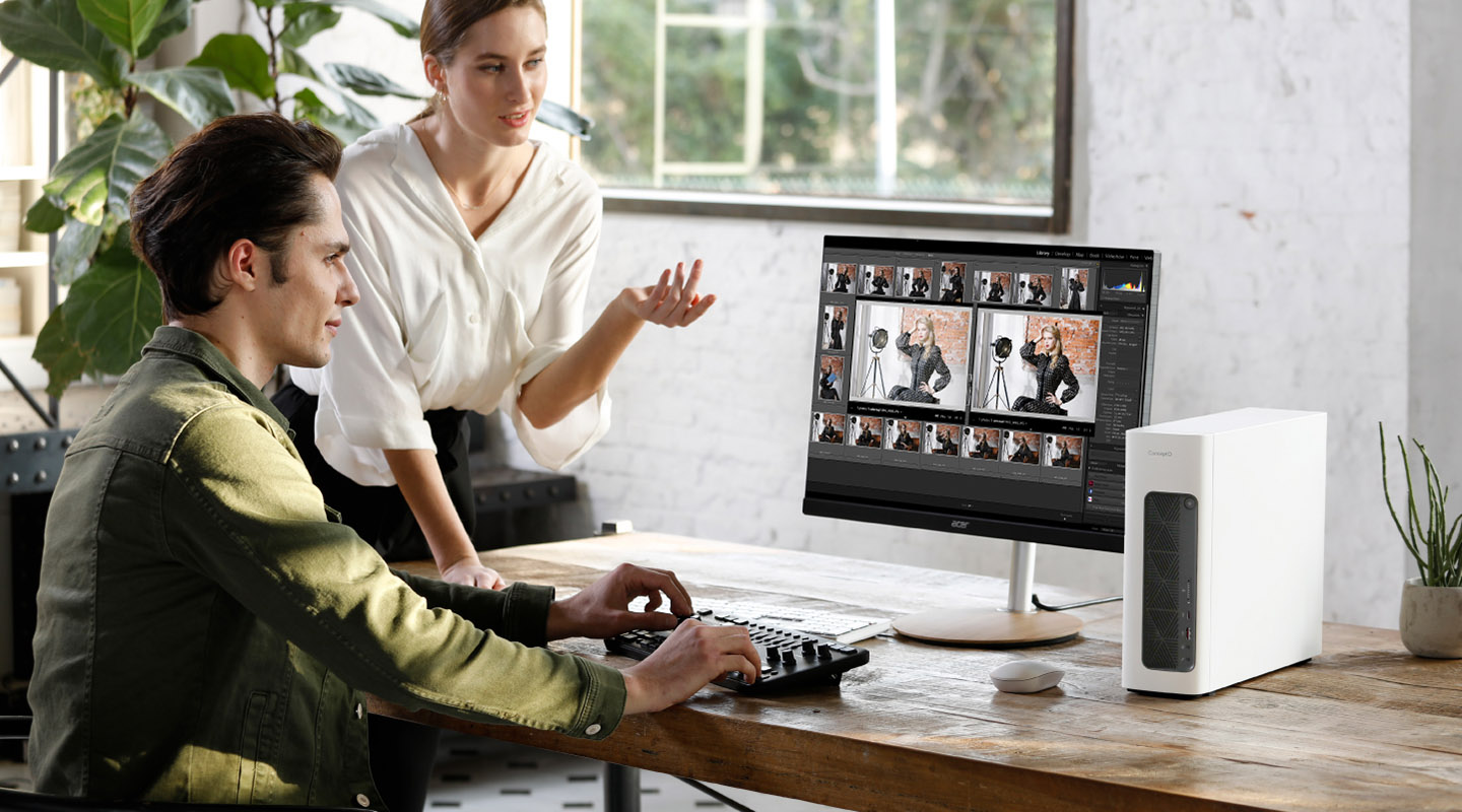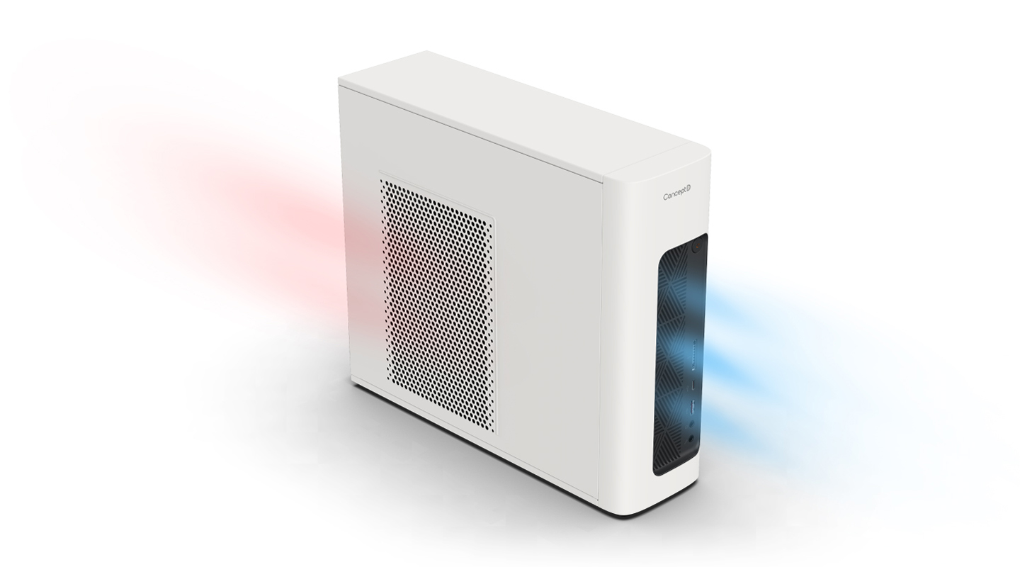 Model ConceptD 100 díky malým rozměrům a bílému, minimalistickému vzhledu se zaoblenými rohy představuje nevtíravý malý stolní počítač pro tvorbu obsahu, který je speciálně navržený k tomu, aby zapadnul do jakékoli moderní kanceláře či studia.