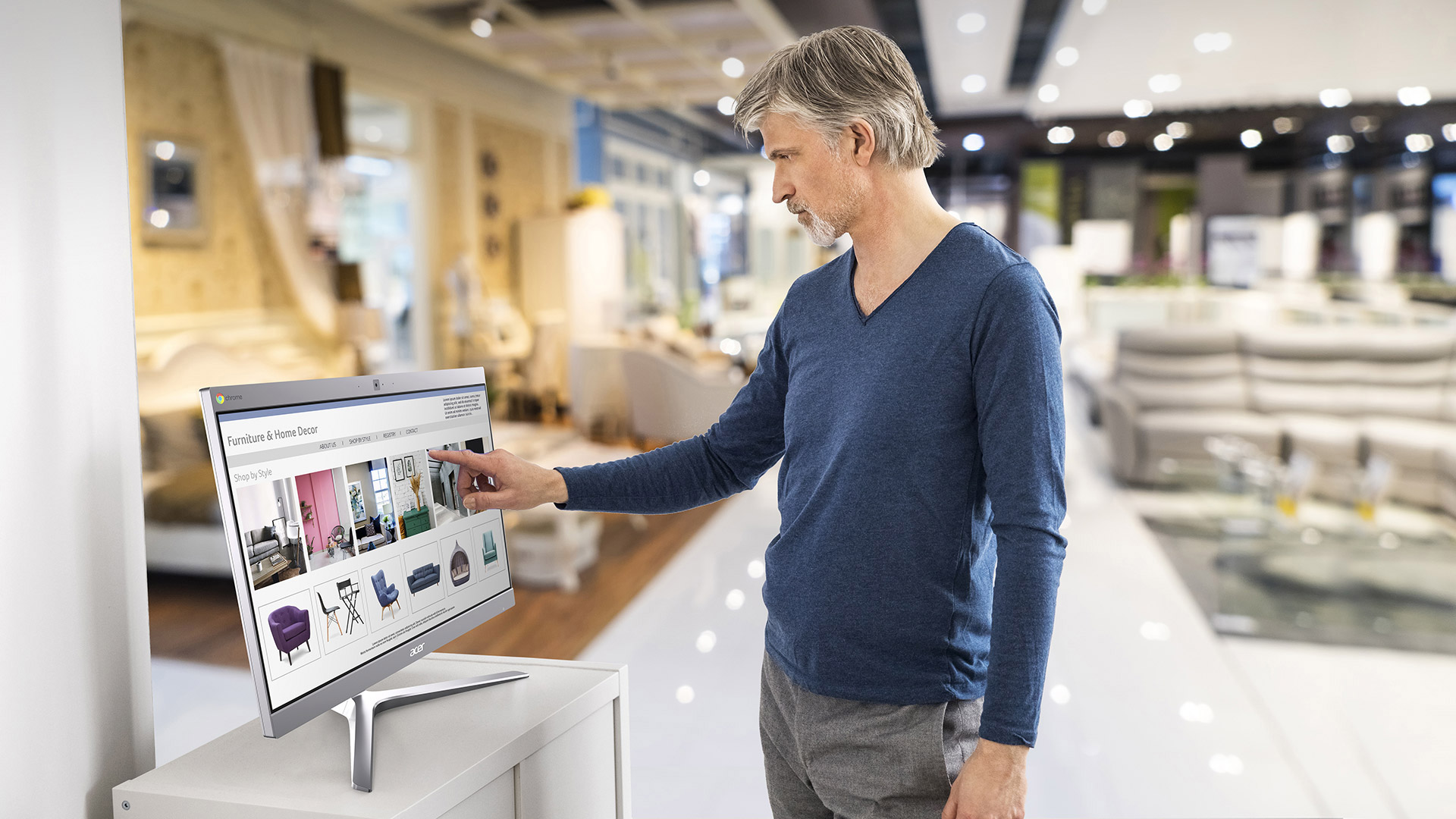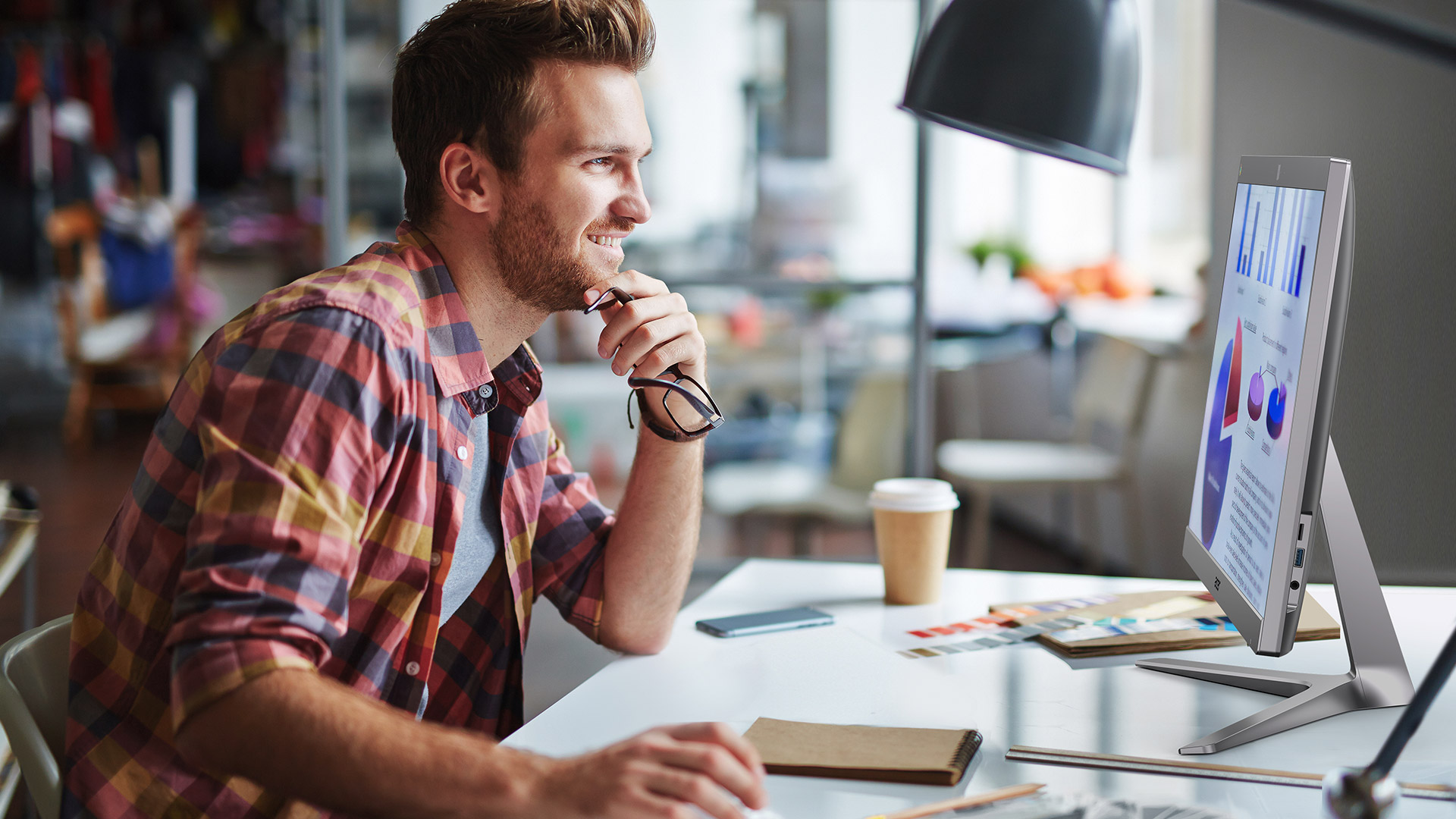 Nádherně tvarovaný 24" počítač vše v jednom se zkoseným stojanem poskytuje vynikající viditelnost za všech světelných podmínek. Dotykový IPS displej FHD 1920 x 1080 s úzkým rámečkem je opatřen povrchovou úpravou proti odleskům a dokáže se naklápět v rozmezí –5° až 25°. Volitelná montážní sada rovněž umožní jeho zavěšení na zeď.