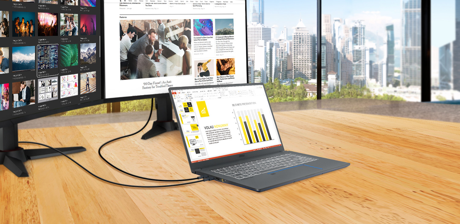 Ve spojení s více porty Thunderbolt 3 podporuje řada Prestige různá připojení, která poskytují energii pro bleskové nabíjení a rozšiřují pohled prostřednictvím několika displejů pro zvýšení Vší produktivity. Uživatelé mohou také nabíjet notebook a připojovat více zařízení prostřednictvím portů USB-C. Slot microSD také nabízí rychlý přenos dat všem tvůrcům.