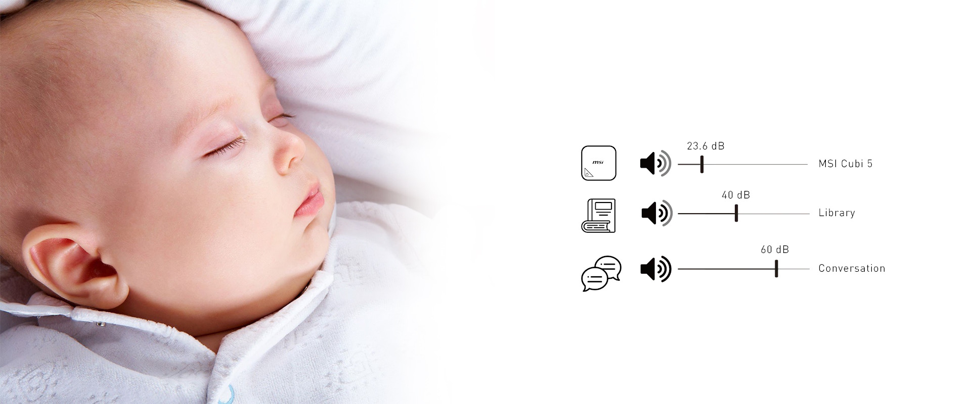 121/5000 MSI Cubi 5 má vynikající konstrukci a ventilátor s nízkou hlučností, což má za následek nízkou hladinu hluku - pouze 23,6 dB v klidovém režimu.