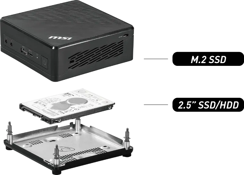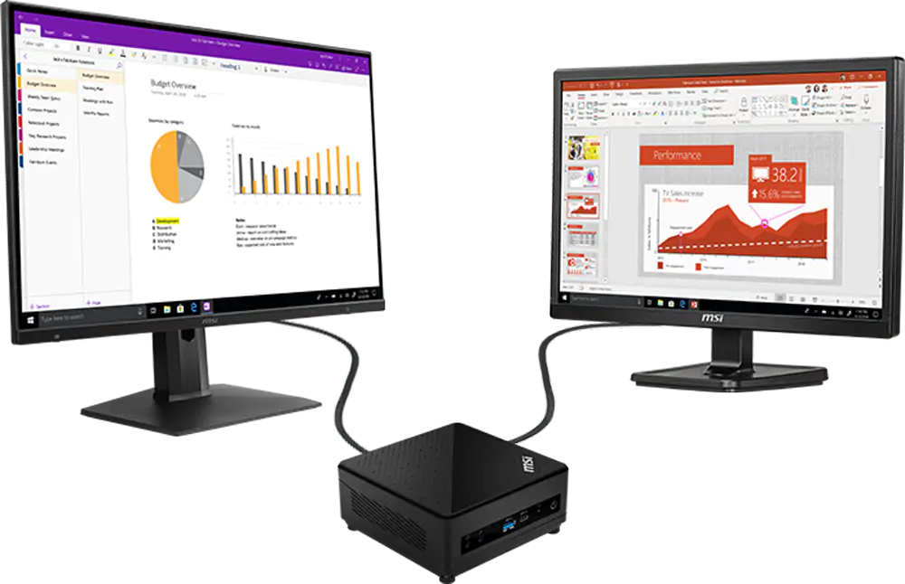 Sledujete spoustu webových stránek a aplikací na malém monitoru? S porty HDMI a DP podporuje MSI Cubi 5 připojení dvou monitorů, takže můžete pracovat efektivněji a sledovat více věcí současně.