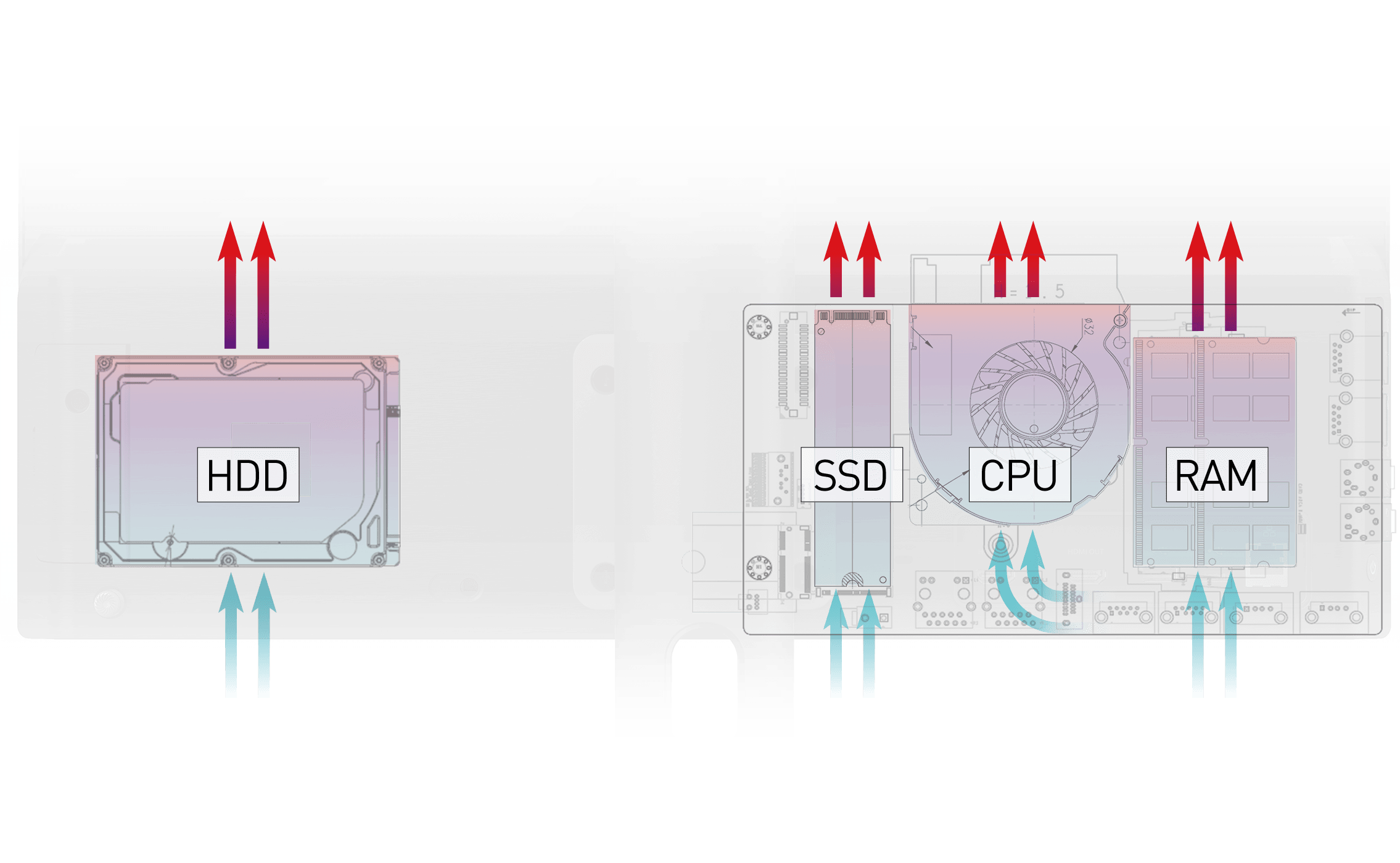 Řada Modern AM272 je vybavena chladicím systémem Silent Pro. Součástí tohoto systému je tepelný modul serverové třídy, který se stará o chlazení různých komponent v systému. Kromě toho jsme nejdůležitější klíčové komponenty umístili na horní stranu, aby teplý vzduch mohl snadno odcházet ven. Oddělili jsme proudění vzduchu, abychom zajistili, že teplota systému zůstane dokonale pod kontrolou pro chladný a tichý provoz.
