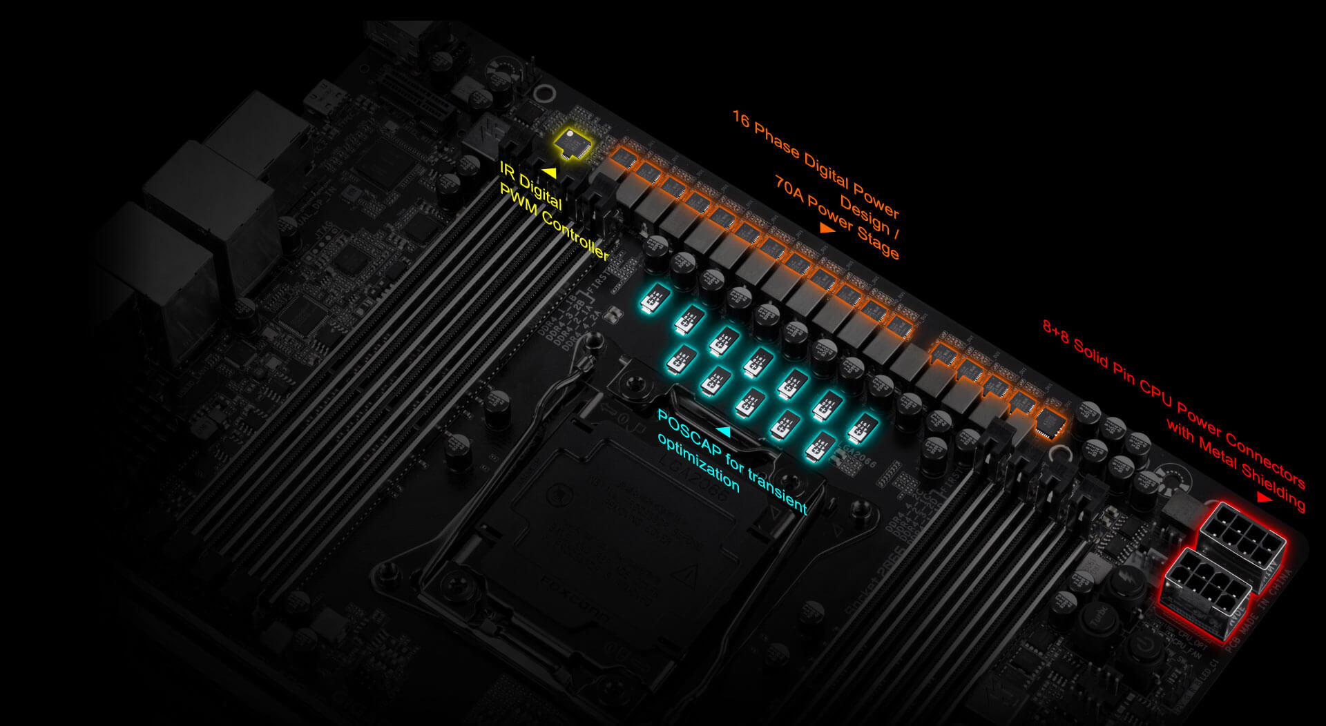 Základní deska X299X AORUS XTREME WATERFORCE využívá návrh kompletně digitálního napájení od IR, které zahrnuje digitální PWM řadič s Power Stage MOSFETy a je schopno poskytovat 70 A energie z každé fáze, celkem neuvěřitelných 1120 A. Tento 100% digitální řadič a k tomu 8+8pinové napájení procesoru s plnými piny nabízejí neuvěřitelnou přesnost v poskytování energie do nejnáročnějších a na energii citlivých součástí základní desky, což nadšencům umožňuje získat z nových 18jádrových procesorů Intel® Core ™ X absolutně maximální výkon.