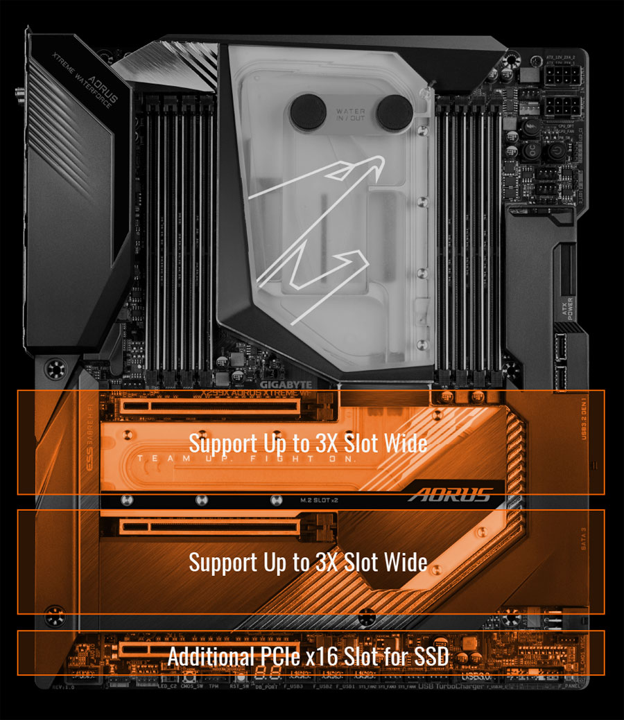 X299X AORUS XTREME WATERFORCE je vybavena třemi plnohodnotnými PCIe x16 sloty se speciální polohou pro umístění dvou tříslotových grafických karet, přičemž budete stále mít dostatek prostoru pro PCIe x16 AIC SSD kartu.
