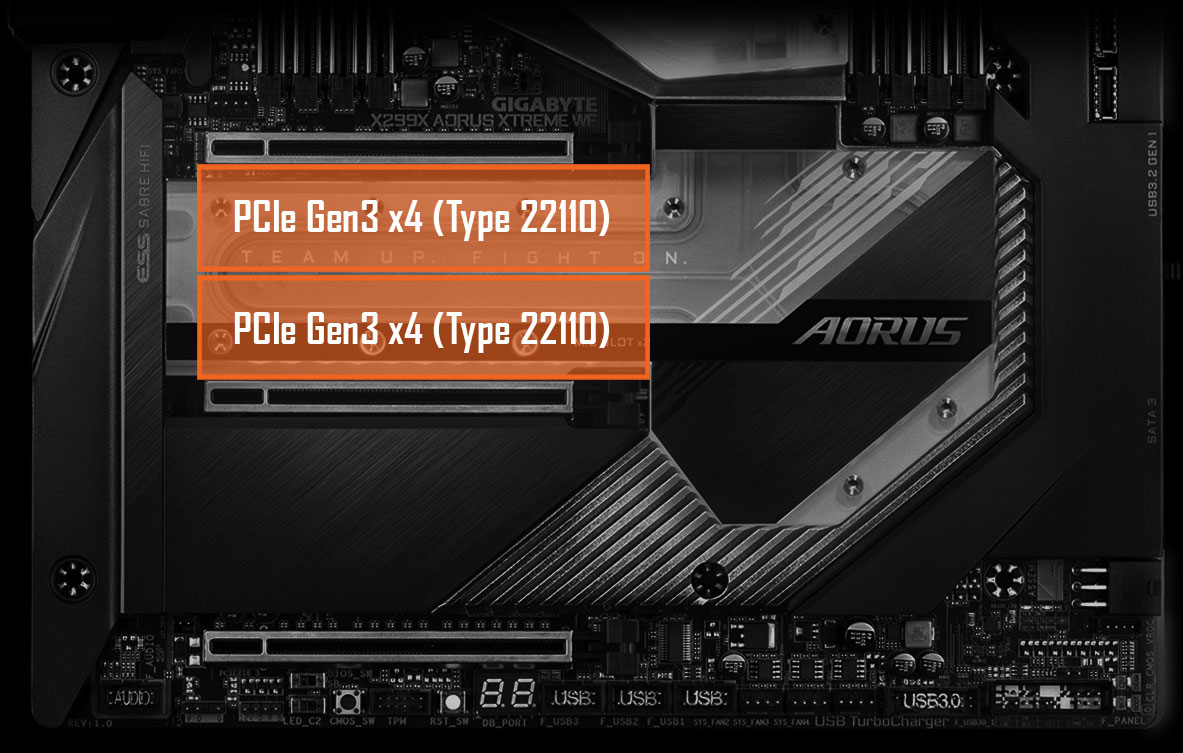 Základní desky AORUS Gaming jsou zaměřeny na poskytování technologie M.2 nadšencům, kteří chtějí maximalizovat potenciál své sestavy. Poloha této dvojice M.2 slotů byla pečlivě zvolena tak, aby byly M.2 SSD chlazeny vodou a nikdy se nesetkaly s žádným problémem v podobě škrcení výkonu.