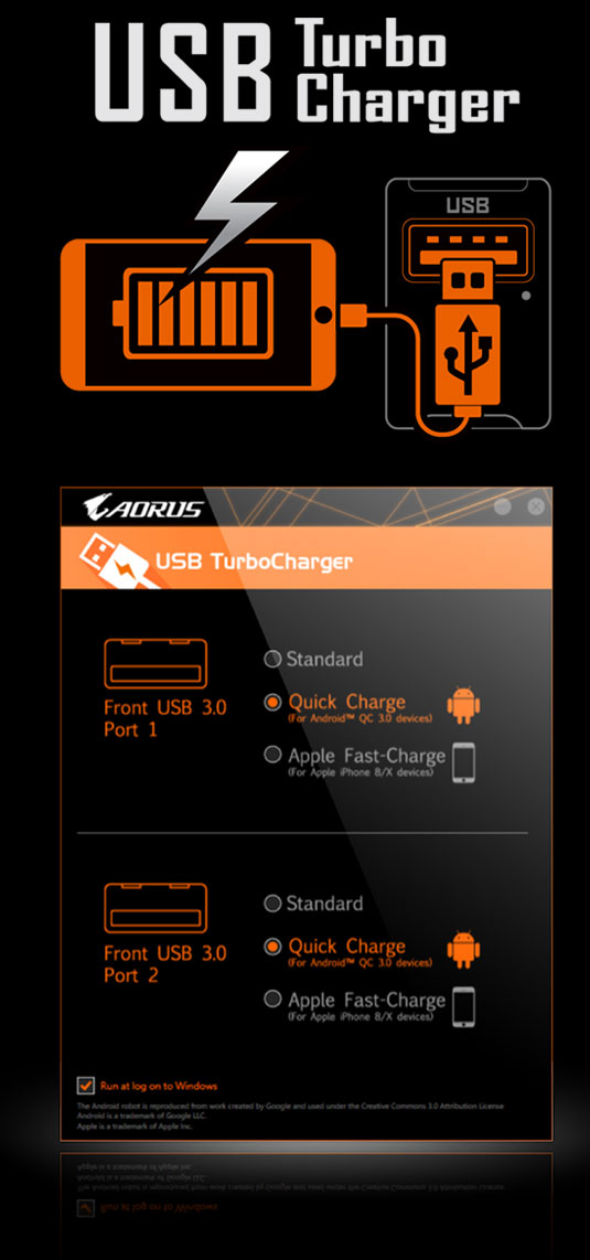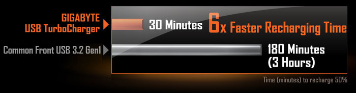 Patentovaná technologie USB GIGABYTE TurboCharger uživatelům umožňuje dobíjet jejich mobilní zařízení ohromující rychlostí až 50% za méně než 30 minut*. Po připojení předních USB 3.2 Gen1 typ A k této základní desce může USB TurboCharger dobíjet jak Android zařízení pomocí QC 3.0, tak Apple zařízení s funkcí Apple Fast-Charge.