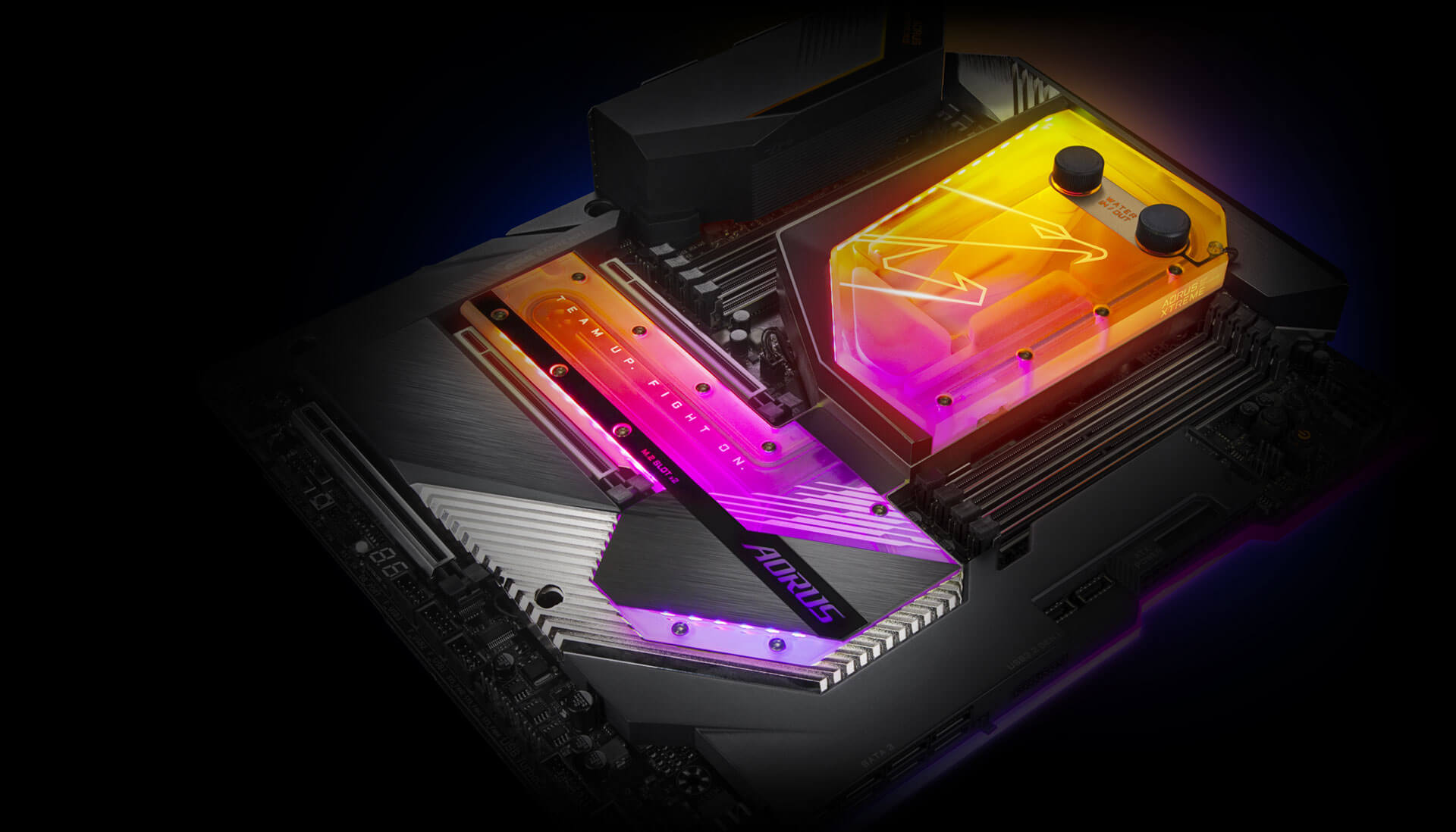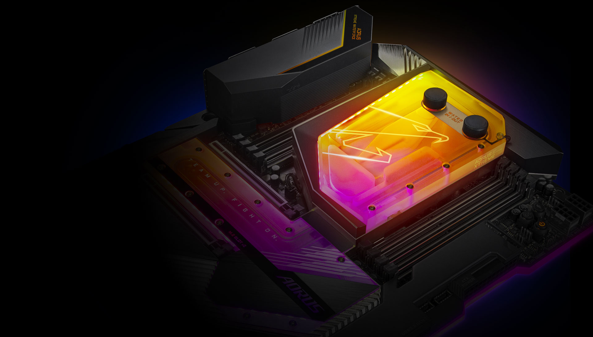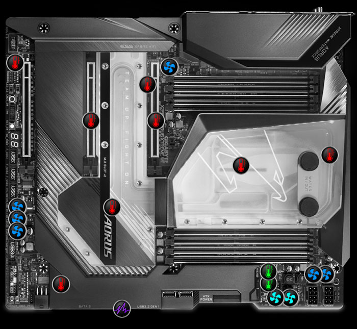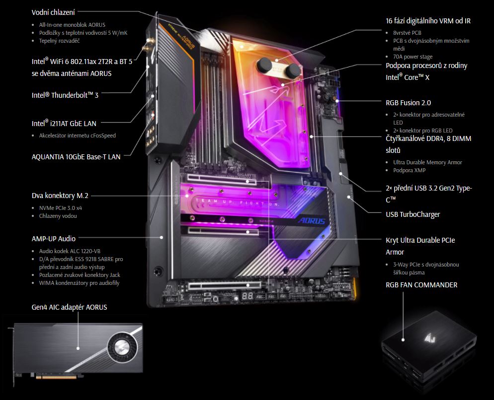 X299X AORUS XTREME WATERFORCE využívá první CPU/VRM/SSD/PCH monoblok na světě pro zajištění vysoké stability a nízkých teplot i při plné zátěži aplikacemi či při hraní her.