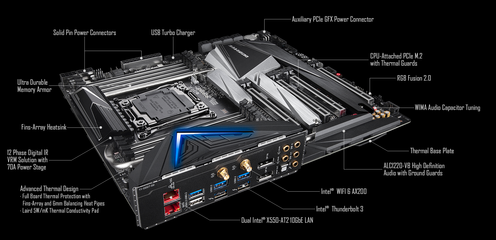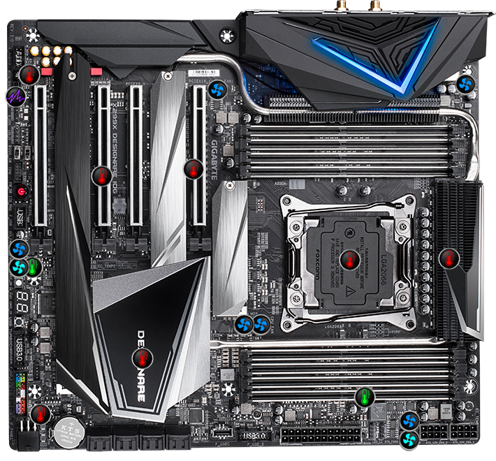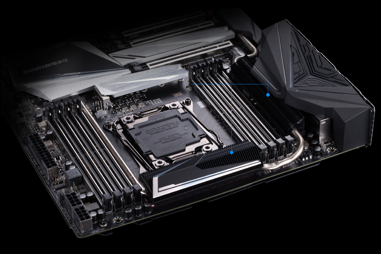 Procesor CPU čerpá větší množství energie než kdy jindy. Chlazení je tlačeno na hranici. X299X DESIGNARE 10G se vyznačuje kompletní ochranou desky proti přehřívání s plombami a vyvažovacími 6mm heatpipe. Abychom mohli umístit kompletní tepelnou ochranu desky, snažíme pro ni umést cestu. Nechybí žebrovaný chladič, který zvyšuje oblast rozptylu tepla o 300 % ve srovnání s běžnými chladiči stejné velikosti. Použitím LAIRD podložky s tloušťkou 1,5 mm a vysokou tepelnou vodivostí 5W/mK, je přenášeno 2,7× více tepla než s běžnou podložkou během stejného časového úseku. 6mm heatpipe pomáhá přenášet teplo mezi chladiči, aby se rychleji dosáhlo tepelné rovnováhy. Na zadní straně základní desky vyžíváme nanokarbonový povlak, což vede k o 10 % chladnějším MOSFETům.
