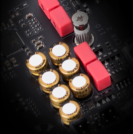 Desky DESIGNARE se mohou pochlubit kombinací kondenzátorů WIMA FKP2 třídy Hi-Fi a špičkových zvukových kondenzátorů Chemicon. Zatímco špičkové audio kondenzátory jsou vhodné pro vysoce kvalitní zvuková zařízení využívající nejmodernější technologii k zajištění bohatého zvuku v basech a jasnějších vysokých frekvencích, kondenzátory WIMA FKP2 jsou široce používány v prvotřídních Hi-Fi systémech. Jejich přidání k exkluzivní technologii AORUS AMP-UP Audio přináší ideální zvukové řešení na desce pro nejnáročnější audiofily.
