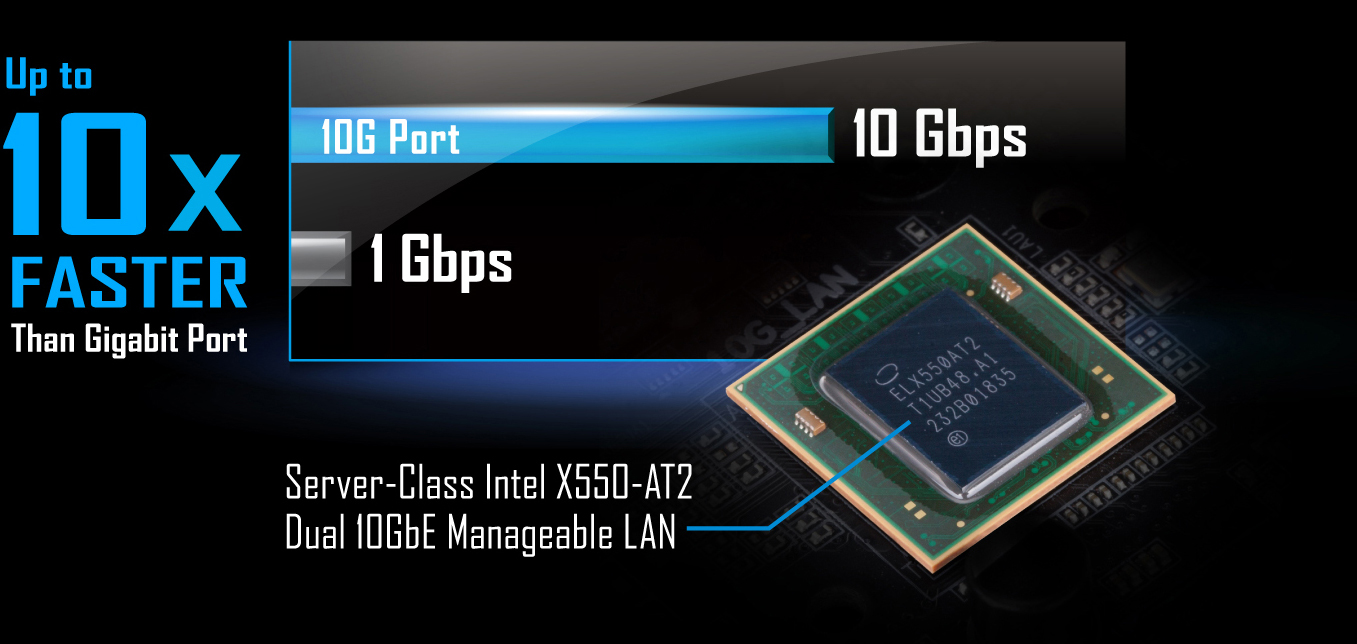 Předinstalovaná LAN Intel® X550-AT2 serverové třídy poskytuje počítači duální spravovatelné 10Gb/s připojení, dále zvyšuje výkon a spolehlivost komunikace mezi klienty.