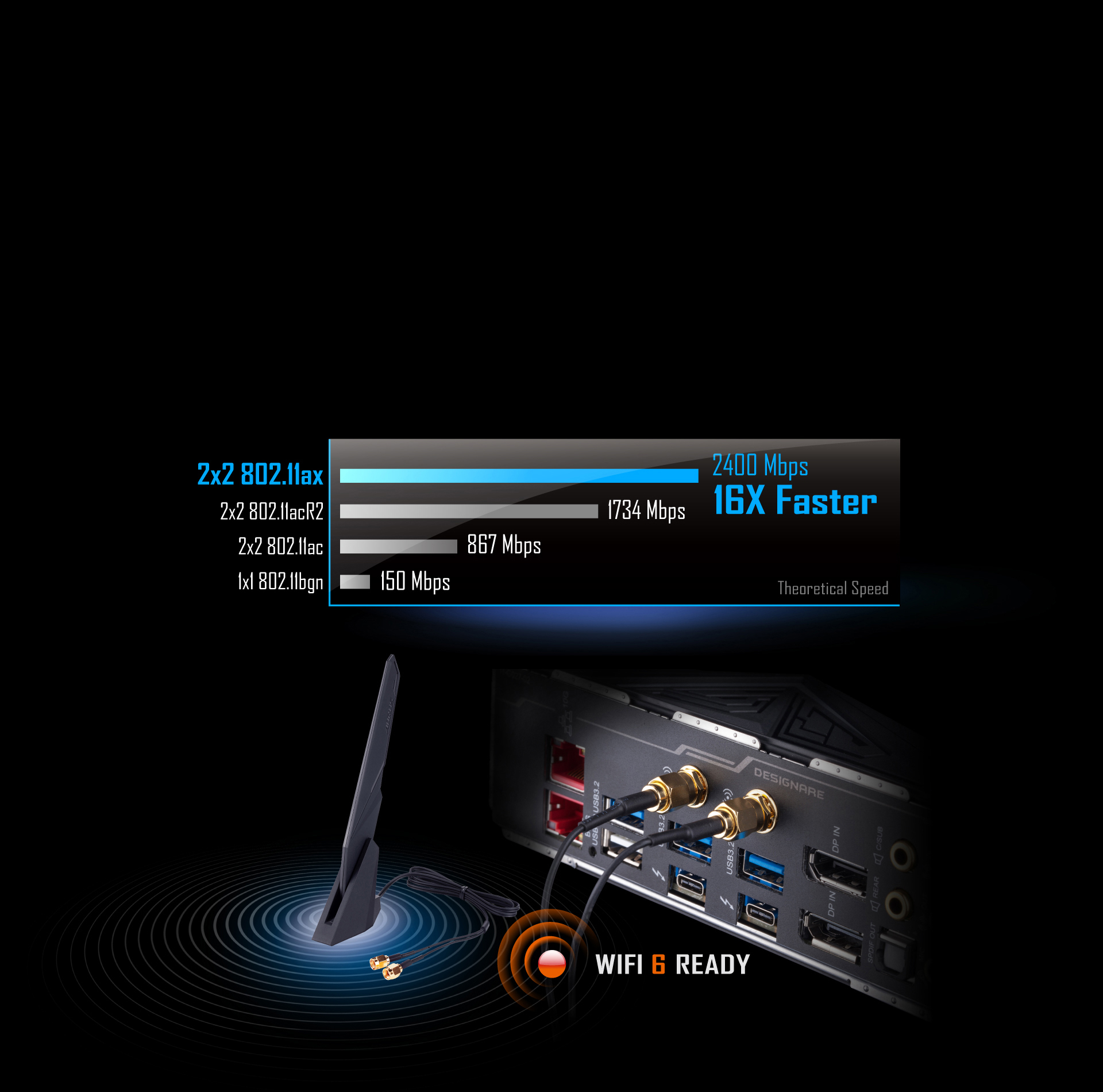 Řešení Intel Wireless podporuje standard 802.11ax, umožňuje gigabitové bezdrátové přenosy, poskytuje plynulé streamování videa, lepší zážitky z hry, méně přerušených připojení a rychlost až 2,4 Gb/s *. Bluetooth 5 navíc nabízí 4× větší dosah než BT 4.2 a rychlejší přenosy.