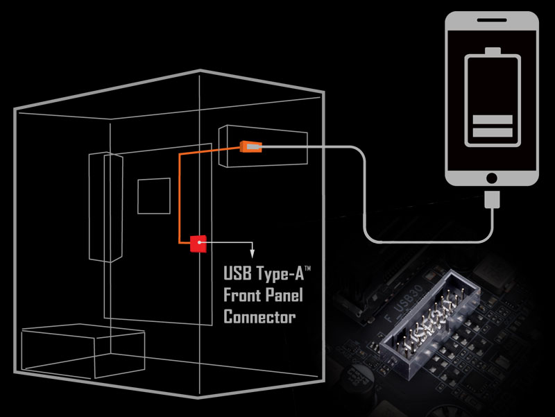 Patentovaná technologie USB GIGABYTE TurboCharger uživatelům umožňuje dobíjet jejich mobilní zařízení ohromující rychlostí až 50% za méně než 30 minut*. Po připojení předních USB 3.2 Gen1 typ A k této základní desce může USB TurboCharger dobíjet jak Android zařízení pomocí QC 3.0, tak Apple zařízení s funkcí Apple Fast-Charge.