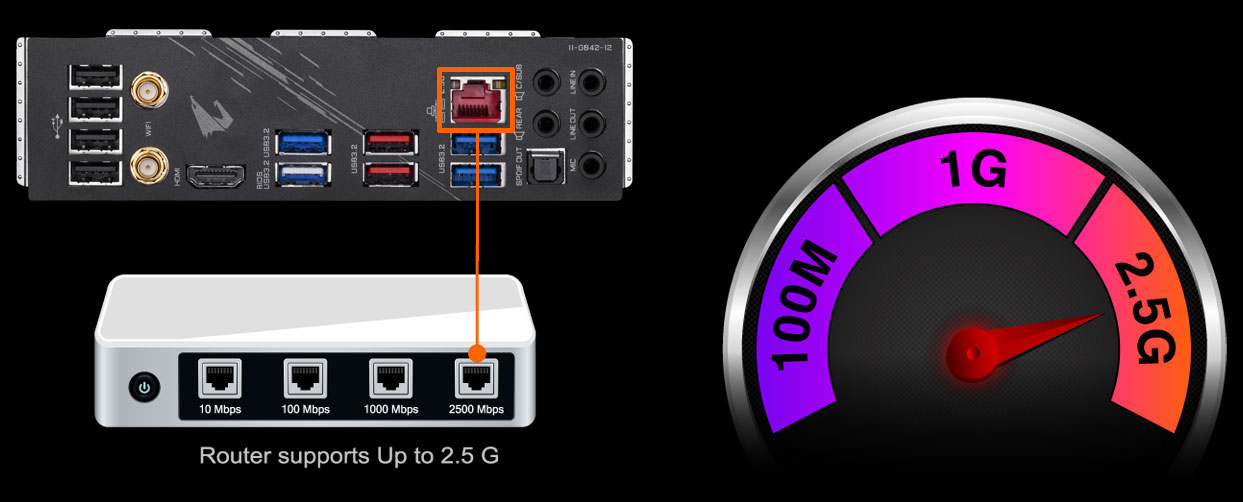 S využitím 2.5G LAN získáte připojení na síť 2,5 GbE s minimálně dvojnásobnou rychlostí proti běžně používanému 1GbE. Perfektně se hodí pro hráče a streamery a nabízí ultimátní a hladký běh online. Je zpětně kompatibilní s Multi-Gig (10/100/1000/2500Mbps) ethernetem s RJ-45.