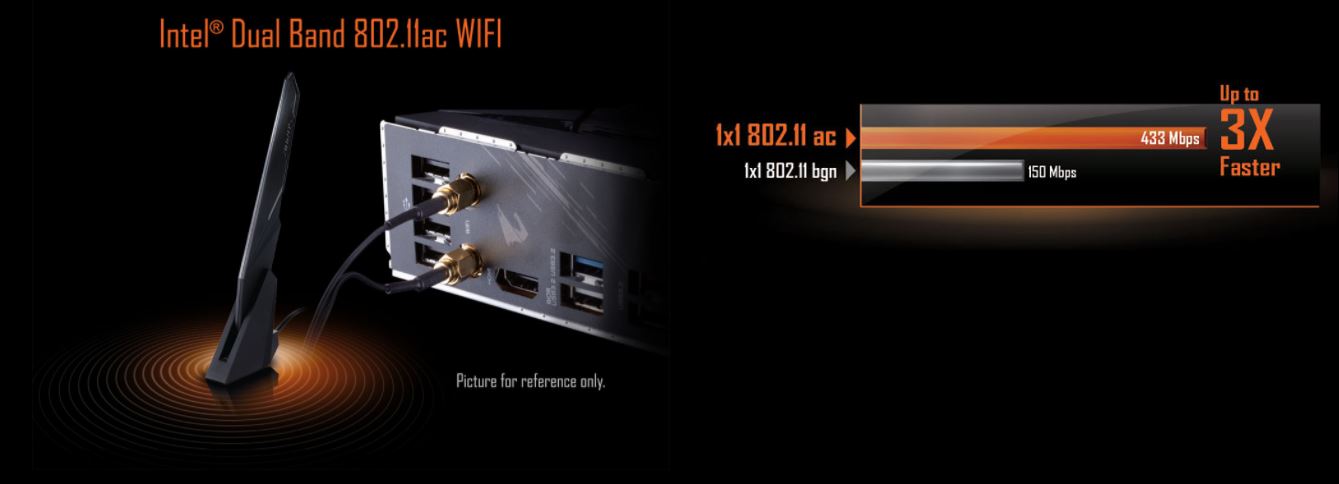 Integrovaný modul 802.11ac WIFI od společnosti Intel® podporuje Dual Band a až 433 Mb / s, 3x vyšší rychlost WIFI než 802.11n a také podporuje BLUETOOTH 5.