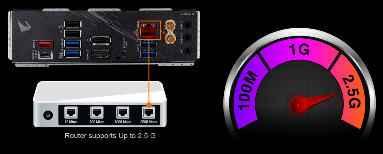 Přijetí 2,5G LAN poskytuje až 2,5 GbE síťové připojení, s minimálně dvakrát vyššími přenosovými rychlostmi ve srovnání s běžnou sítí 1GbE. Je to perfektně vyladěno pro hráče a streamery pro dokonalý a bezproblémový online zážitek. Je také zpětně kompatibilní s ethernetem RJ-45 Multi-Gig (10/100/1000/2 500 Mb / s).