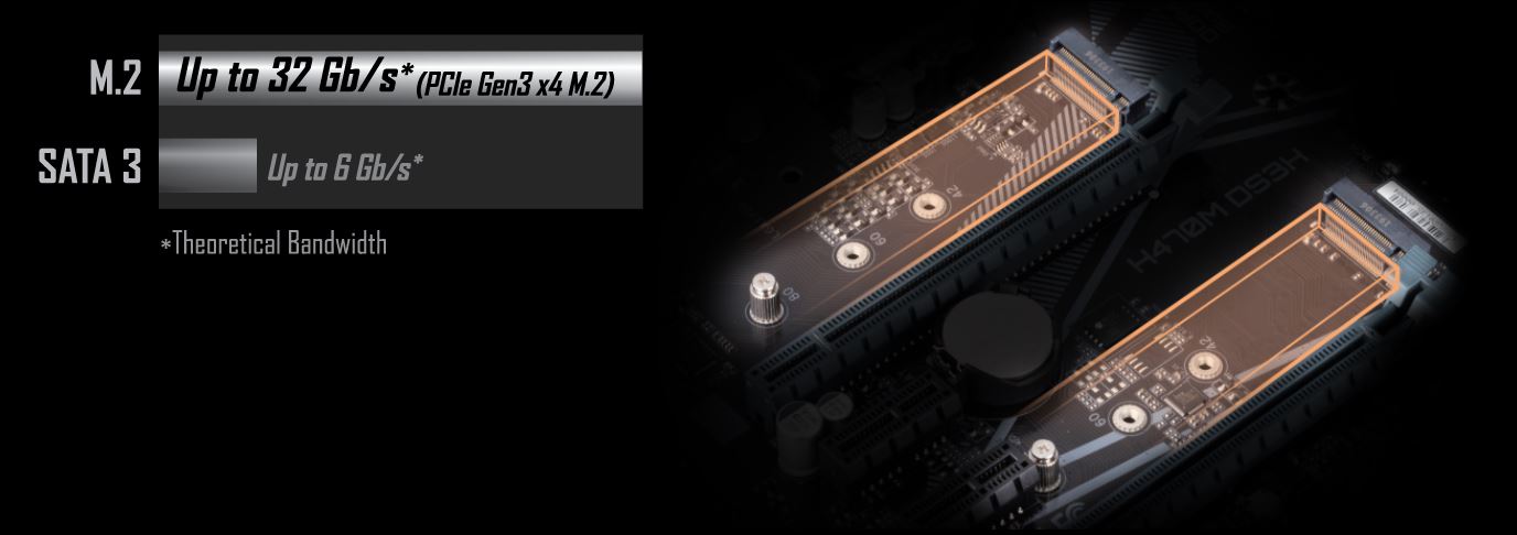 Díky dvěma integrovaným konektorům NVMe PCIe Gen3 x4 M.2 přinášejí základní desky GIGABYTE uživateli připojení PCI-Express pro zařízení SSD. Díky rychlosti přenosu dat až 32 Gb/s na konektor poskytuje duální M.2 ideální řešení úložiště, protože podporuje také režimy RAID.