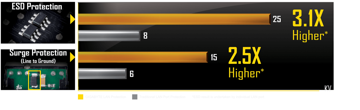 Základní desky GIGABYTE používají integrované obvody s až třikrát vyššími úrovněmi ochrany vůči ESD v porovnání s tradičními integrovanými obvody. To pomáhá lépe chránit základní desku a její součásti před potenciálními poškozením způsobenými statickou elektřinou. Základní desky GIGABYTE jsou vybaveny speciálními integrovanými obvody přepěťové ochrany, které chrání základní desku a váš počítač před jakýmkoli nárůstem energie, jaké mohou nastat. To pomáhá zajistit, že se počítač vypořádá s případnými nepravidelnými a nekonzistentními přísuny energie.