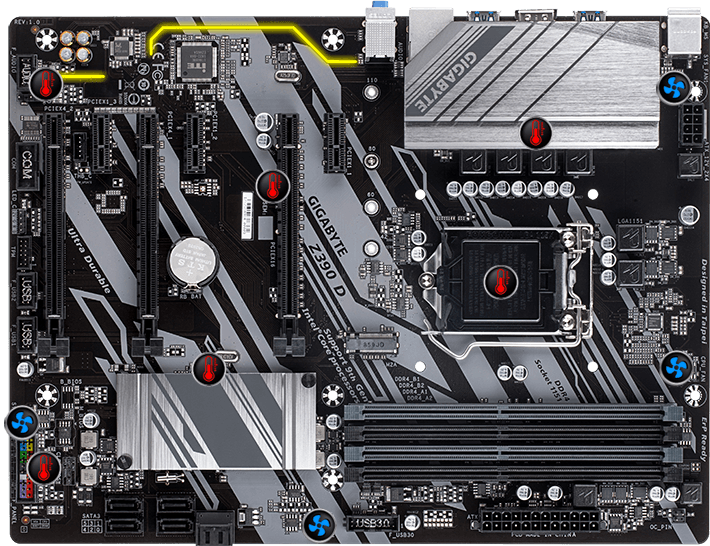 Základní desky GIGABYTE používají integrované obvody s až třikrát vyššími úrovněmi ochrany vůči ESD v porovnání s tradičními integrovanými obvody. To pomáhá lépe chránit základní desku a její součásti před potenciálními poškozením způsobenými statickou elektřinou. Základní desky GIGABYTE jsou vybaveny speciálními integrovanými obvody přepěťové ochrany, které chrání základní desku a váš počítač před jakýmkoli nárůstem energie, jaké mohou nastat. To pomáhá zajistit, že se počítač vypořádá s případnými nepravidelnými a nekonzistentními přísuny energie.